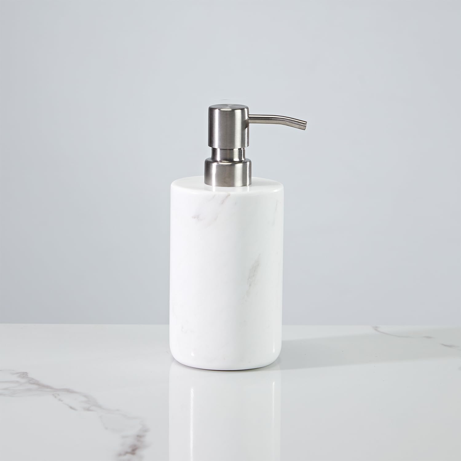 White marble bath accessories are luxurious additions to any bathroom, offering a timeless and elegant aesthetic. Crafted from high-quality natural marble, these accessories can include soap dishes, toothbrush holders, trays, dispensers and more. The white marble brings a sense of sophistication and style to the bathroom, while also being durable and easy to clean. With its cool, smooth surface and unique veining patterns, white marble bath accessories add a touch of luxury and refinement to your daily routine.Dimensions:White Marble Soap Pump 3" dia x 5.25"H,Net Weight:1.76 LBSWhite Marble Tissue Box Cover 5.6"W x 5.6"D x 6.2"H,Net Weight:8.81 LBSWhite Marble Vanity Tray 12"W x 6"D x 0.75"H,Net Weight:3.52 LBSWhite Marble Wastebasket 7.5"Wx7.5"Dx10"H,Net Weight:14.1 LBSWhite Marble Bath Caddy 32"W x 8"D x 2.25"H,Net Weight:31.96 LBSWhite Marble Toothbrush Holder 3" dia x 3.5"H,Net Weight:1.1LBS