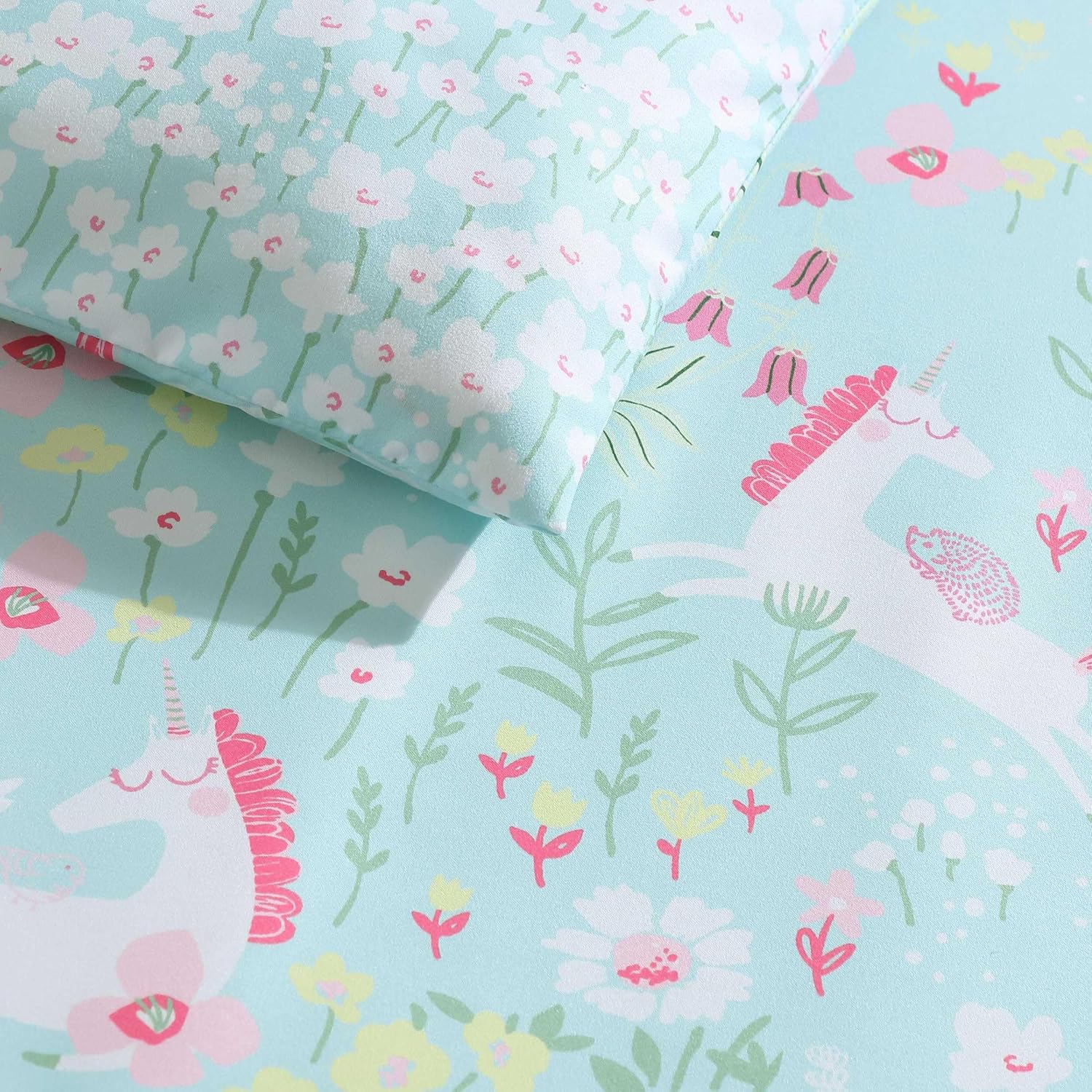 The Laura Ashley Kids Magical Unicorn Comforter Bonus Set in aqua blue and pink features enchanting unicorn designs, surrounded by a floral pattern in a soft and playful color palette. The combination of aqua blue and pink adds a dreamy and whimsical feel, making it a fantastic choice for a children's bedroom. Ensemble is constructed with 100% cozy microfiber and is a comfortable, medium weight that is perfect for year round use. Comforter fill is 100% polyester. Set includes one comforter, two standard shams (one for twin/twin XL set) and one bonus decorative pillow. Set is CPSIA tested, certified safe for children 12 and under and is machine washable for easy care.