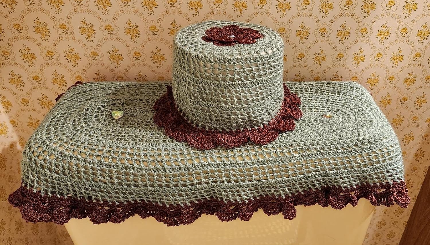 The green and copper color scheme provides a balanced and harmonious look, with the green adding a natural, calming vibe and the copper introducing a warm, inviting tone. The use of crocheted patterns and textures adds a handcrafted, vintage feel to the bathroom, making it feel cozy and unique. This crocheted bathroom set is perfect for those who appreciate handmade crafts and want to add a personalized touch to their bathroom decor. It makes for a thoughtful gift or a delightful addition to your own home.