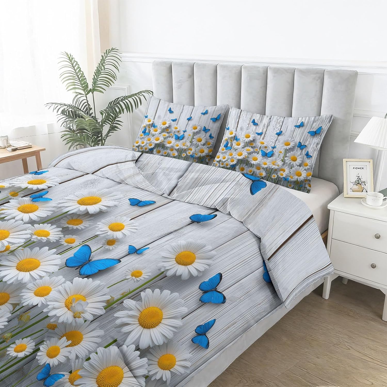 Duvet Cover for Kids Plants Daisies Butterflies Wooden Boards Quilt Cover Sets Reversible Soft Bedspread Cover Room Decor, White Blue Bedding Set Boys Girls Teens (Full Size 80"x90")