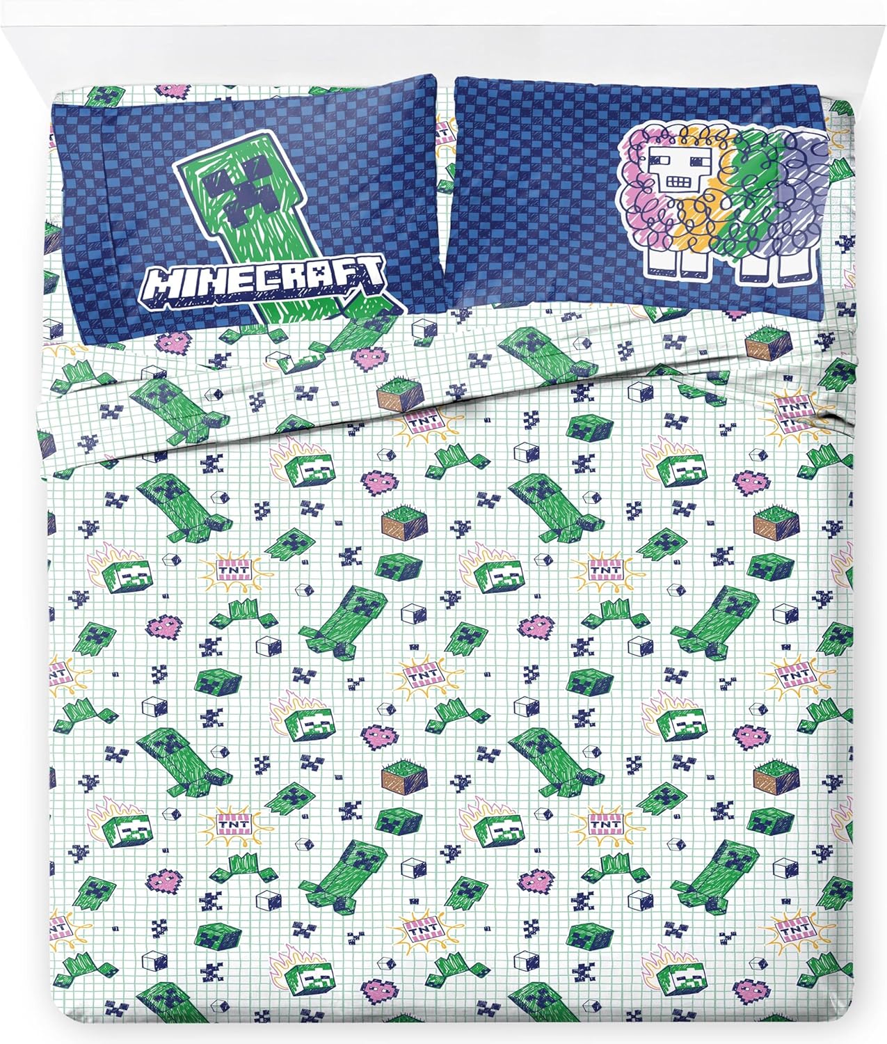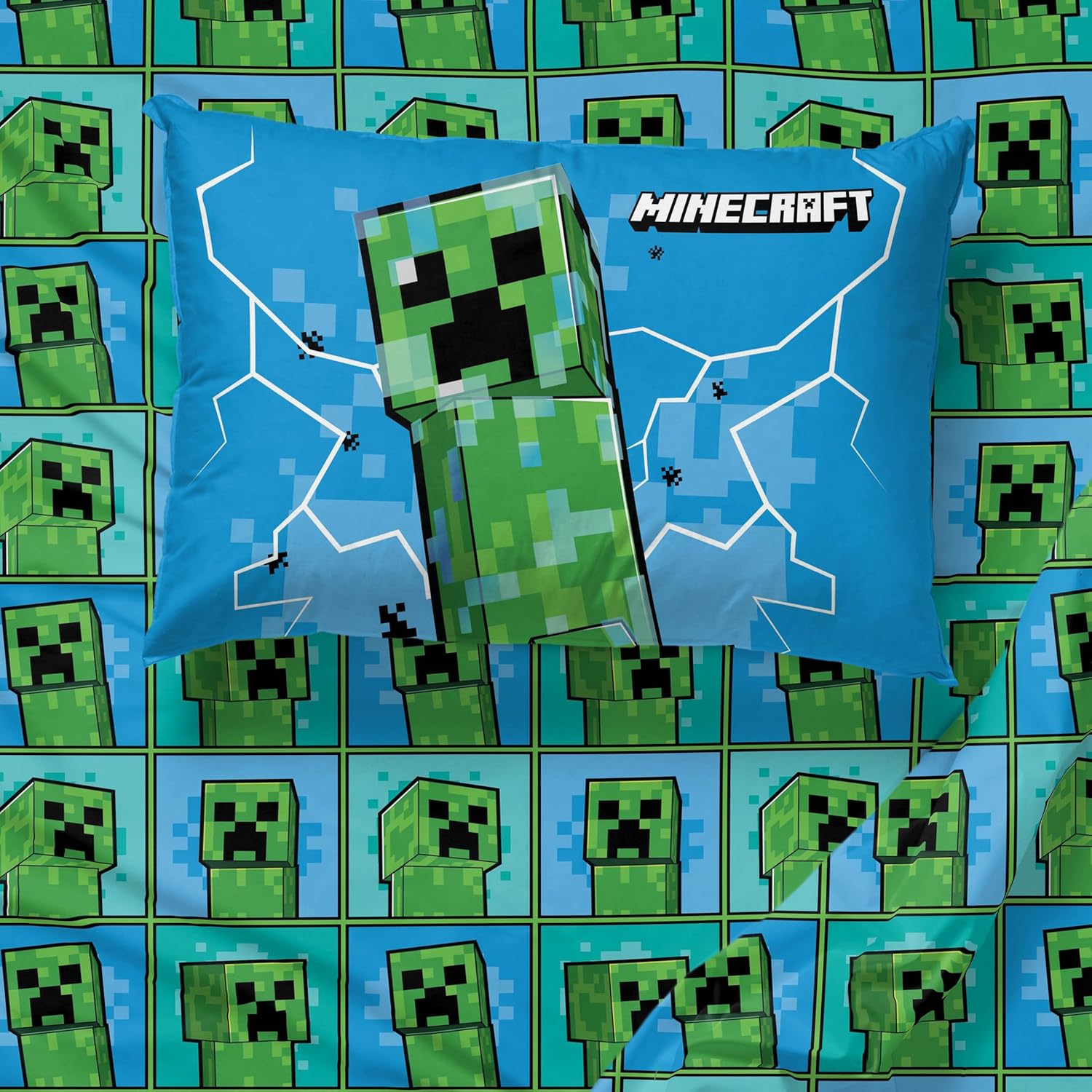 Make bedtime an adventure with this Minecraft twin sheet set! Featuring vibrant and playful creeper designs, this cozy bedding set is perfect for all video game fans. Crafted from ultra-soft microfiber, this set provides exceptional comfort and includes a 39” x 75” fitted sheet with a durable elastic band and 10” deep pockets for a snug fit, a 66” x 96” flat sheet, and a 20” x 30” standard pillowcase for a polished bedding ensemble (comforter sold separately). Designed for both style and coziness, these sheets add a touch of fun digital vibes to any kid’s room decor. Bring home the timeless charm of the Minecraft game with this captivating Minecraft gift, making bedtime more exciting and magical for any fan!