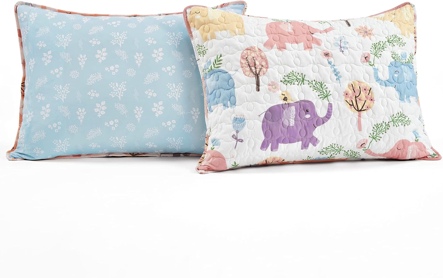 Add a playful animal print to your childs bedroom with the Lush Decor Hygge Elephant Reversible Quilt Set. The front features a whimsical design of smiling elephants in pastel colors marching through a field of colorful trees and florals. Enjoy two stylish looks in one set! Simply flip this quilt over to reveal a small floral pattern. Switch up your kids bedroom decor as often as you'd like with this cute bedding set. You're little one will love elephant decor! Elephants symbolize strength, honor, patience, luck, fortune, and protection. Available in twin and full/queen sizes. This toddler bedding set includes 1 reversible comforter, 1 or 2 pillow shams, and 1 decorative pillow. The lumbar pillow features a tufted elephant motif. Crafted from a soft microfiber fabric, this elephant quilt set offers softness and comfort. The lightweight polyfill filling is perfect for any season, and even makes this a great layering piece. To care for this kids bedding set, simply machine wash cold on the gentle cycle and tumble dry low. Use a steamer to remove wrinkles, if needed. Spot clean the decorative pillow.