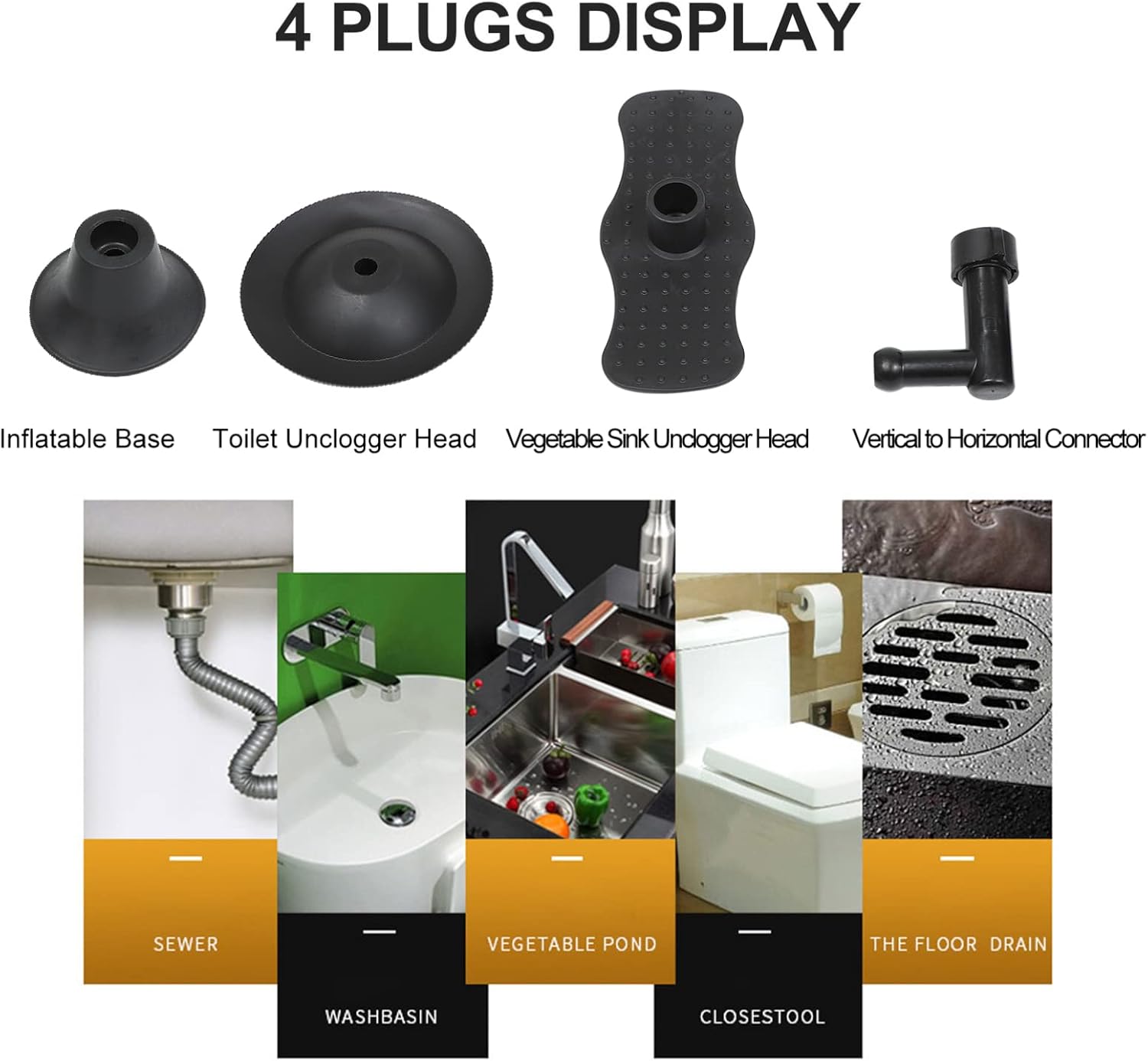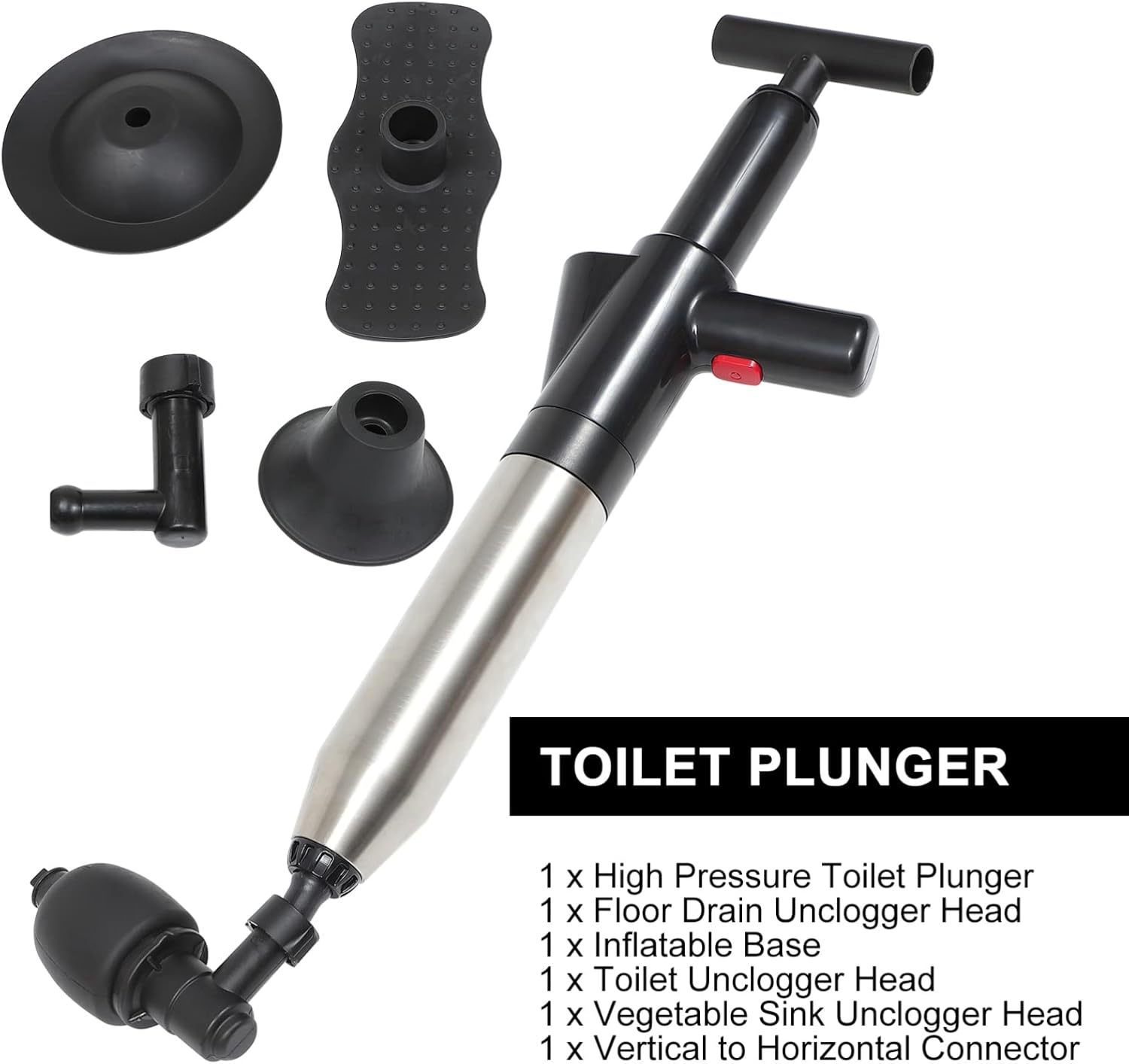 NPQPNAFCDescriptionThis is a toilet plunger cleaner, which is made of premium material, durable use. With this air toilet plunger, keep the bathroom clean and tidy, ergonomic modern design, user- friendly design, easy to hold, sleek, durable, simple and beautiful, grade upgrade, save your time. A nice bathroom helper for your home.Features- Color: Black.- Material: ABS, stainless steel.- Size: 60 X 18 X 7 cm/ 23.58 X 7.07 X 2.75 inch.Package Included1 x High Pressure Toilet Plunger1 x Inflatable Base1 x Floor Drain Unclogger Head1 x Toilet Unclogger Head1 x Unclogger Head1 x Vertical to Horizontal Connector1 x Manual Book