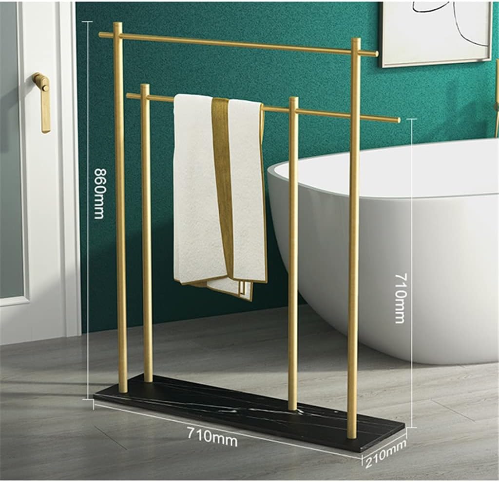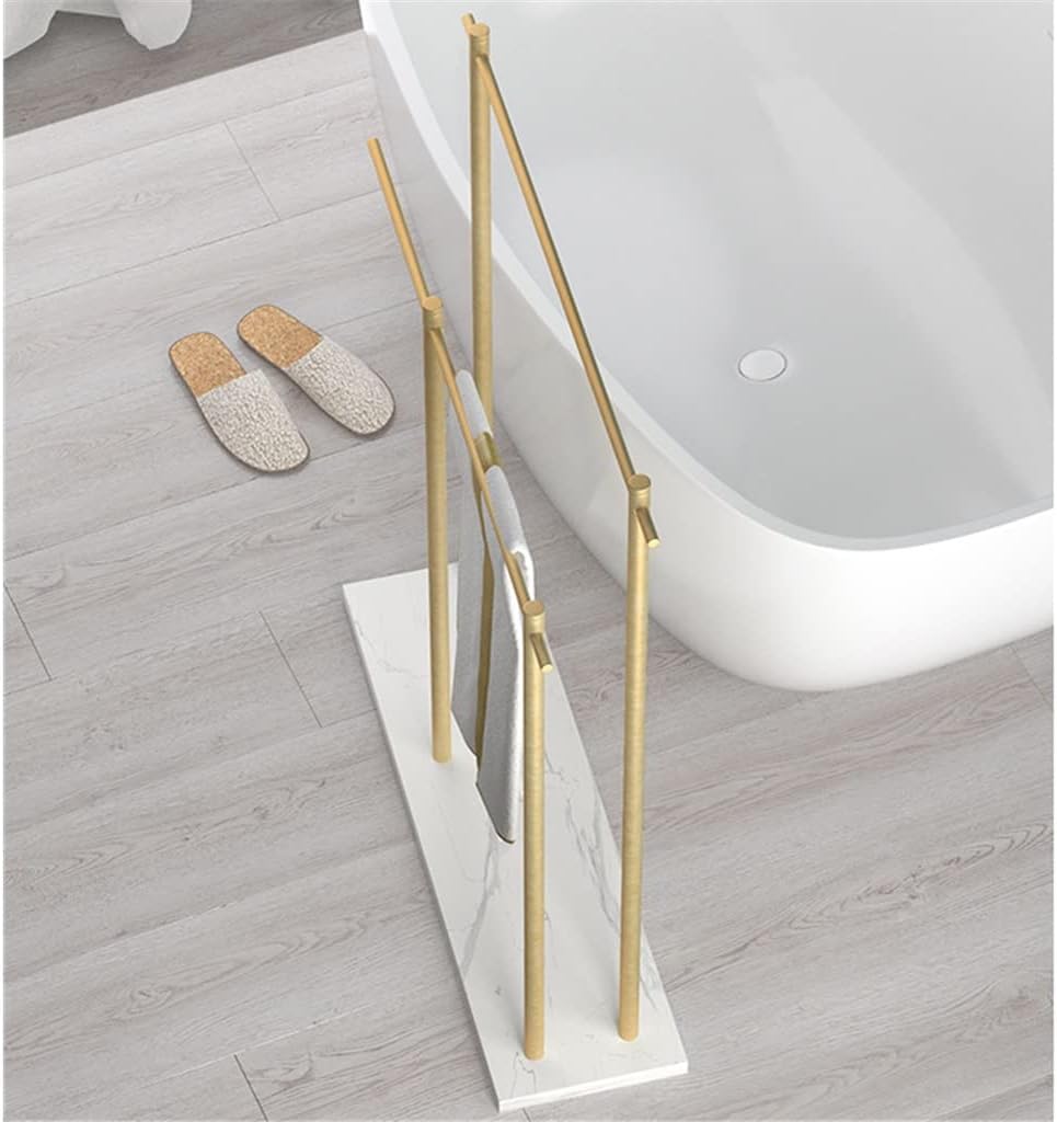 Made of space aluminum+marble materials, and practical for long service life.A minimalist design can not only accommodate more items, but also save more space.2 rungs can be used for hanging towels or for displaying decorative blankets, etc. Also can be a good decoration for your home.Solid structure, smooth feel, elegant shape, giving your room an elegant feeling.Suitable for many places in bathroom, living room, bedroom, balcony and other rooms in your house.Specification:Name:bathroom floor stand towel rackMaterial:space aluminum+marblecolor:gold blackPacking size:60x50x10cmPackage Includes:1Pc x Towel RackNotes:1. Only sell main products, not other products.2. Since manual measurement is required, please leave a space of 1-3 cm.3. Due to screen differences, the color may be slightly different from your expected color, please allow.Remind:After receiving the packaging, please check the packaging and the product carefully. If the received item is defective or has any questions, please contact us via email to resolve the problem. We will reply as soon as possible and do our best to meet yourNotes:1. Please allowed 1-m differences due to manual measurement, thank you for your understanding!2. Due to the difference between different monitors, please understand that the picture may not reflect the actual color of the item.