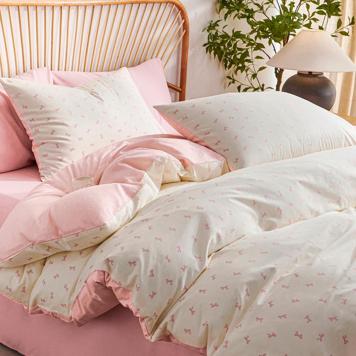 【100% Cotton】:The bow duvet cover (without comforter) is made of 100% Cotton. Surface of fabric is ultra soft, breathable, skin-friendly and durable, non-fading after washing.. 【Unique Design】: Modern aesthetics duvet cover set can deliver peace of mind from tired life and have a comfortable sleeping. And the cute bedding set is easy to match any style home decoration. We offer you a wide selection of colors and styles, pink bow pattern design is suitable for various indoor decoration. Great gift for the Holiday, New Year,Valentine's Day, and Christmas to girls, boys,kids,teens . Excellent Quality Details: The cotton duvet cover has durable hidden zipper closures, which can make you seal off your bedding set easily. And has 4 corner ties to make a tighter fit. So it is easily to be removed and washed. 【Size and Package Include】: Twin size: 1 duvet cover (68" x 90"). 1 pillowcase (20" x 30"). Full size: 1 duvet cover (79" x 90"). 2 pillowcases (20" x 30"). Queen size: 1 duvet cover (90" x 90"). 2 pillowcases (20" x 30"). King size:1 duvet cover (104" x 90") .2 pillowcases(20" x 36"). 【Cleaning Method】: Machine Washable. Gentle cycle with cold water. Do not bleach. Do not iron. 【Warm Tips】: Due to the light and screen setting difference, the beige&pink duvet cover set's actual color may be slightly different from the pictures.