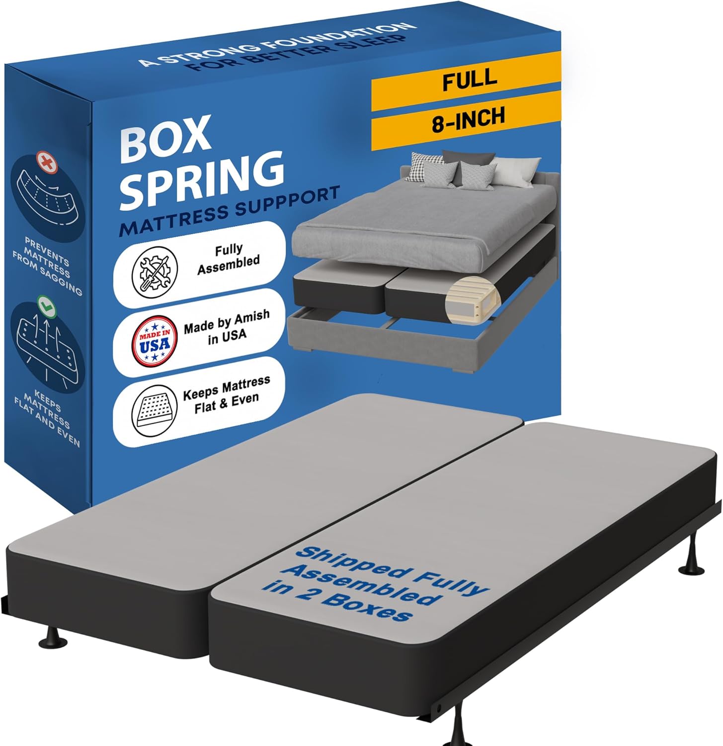 • FULLY ASSEMBLED & COMPACT – This queen bed box spring is fully assembled and 2-pieces to make it easier to move and reduce the chance of damage during shipping. Avoid crushed corners, bent frames and common damages—everything arrives protected and ready to use inside the room.