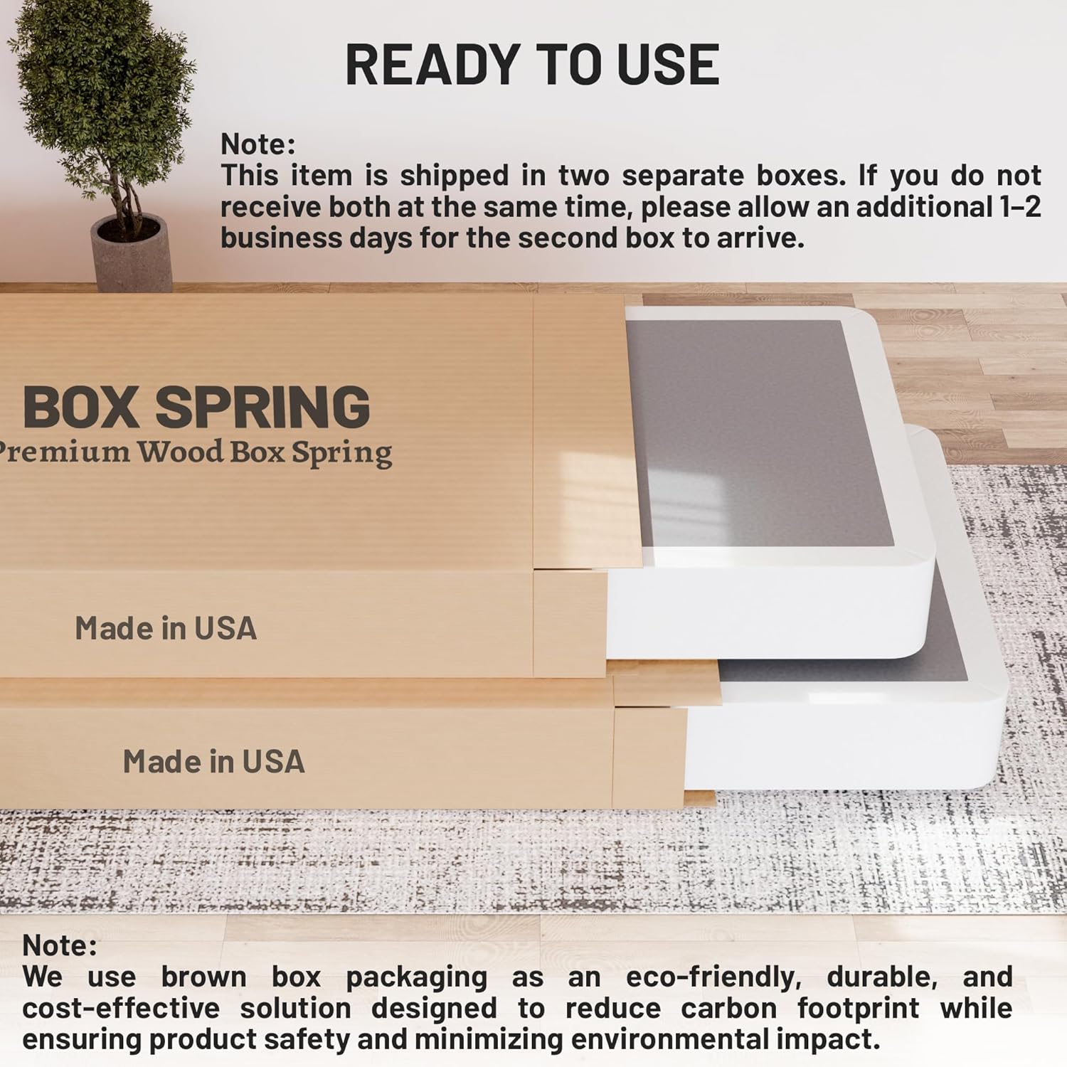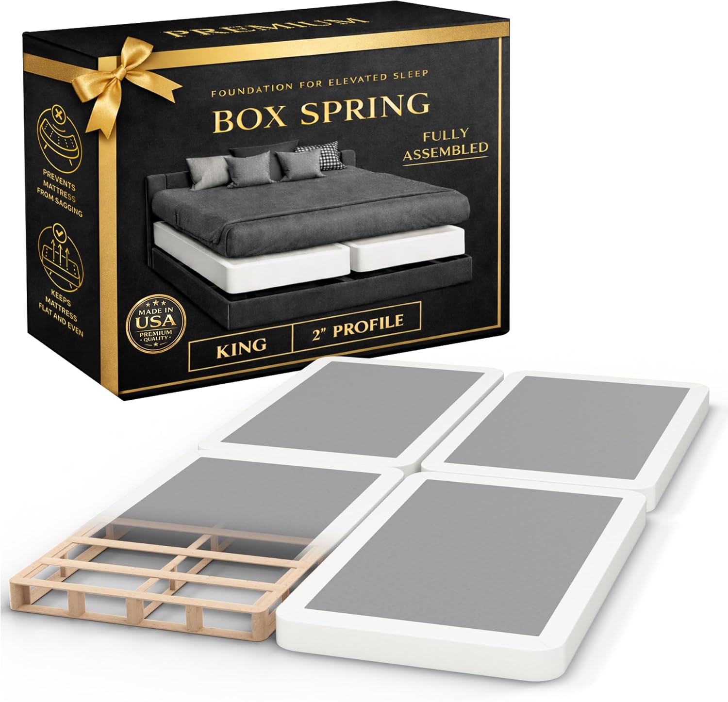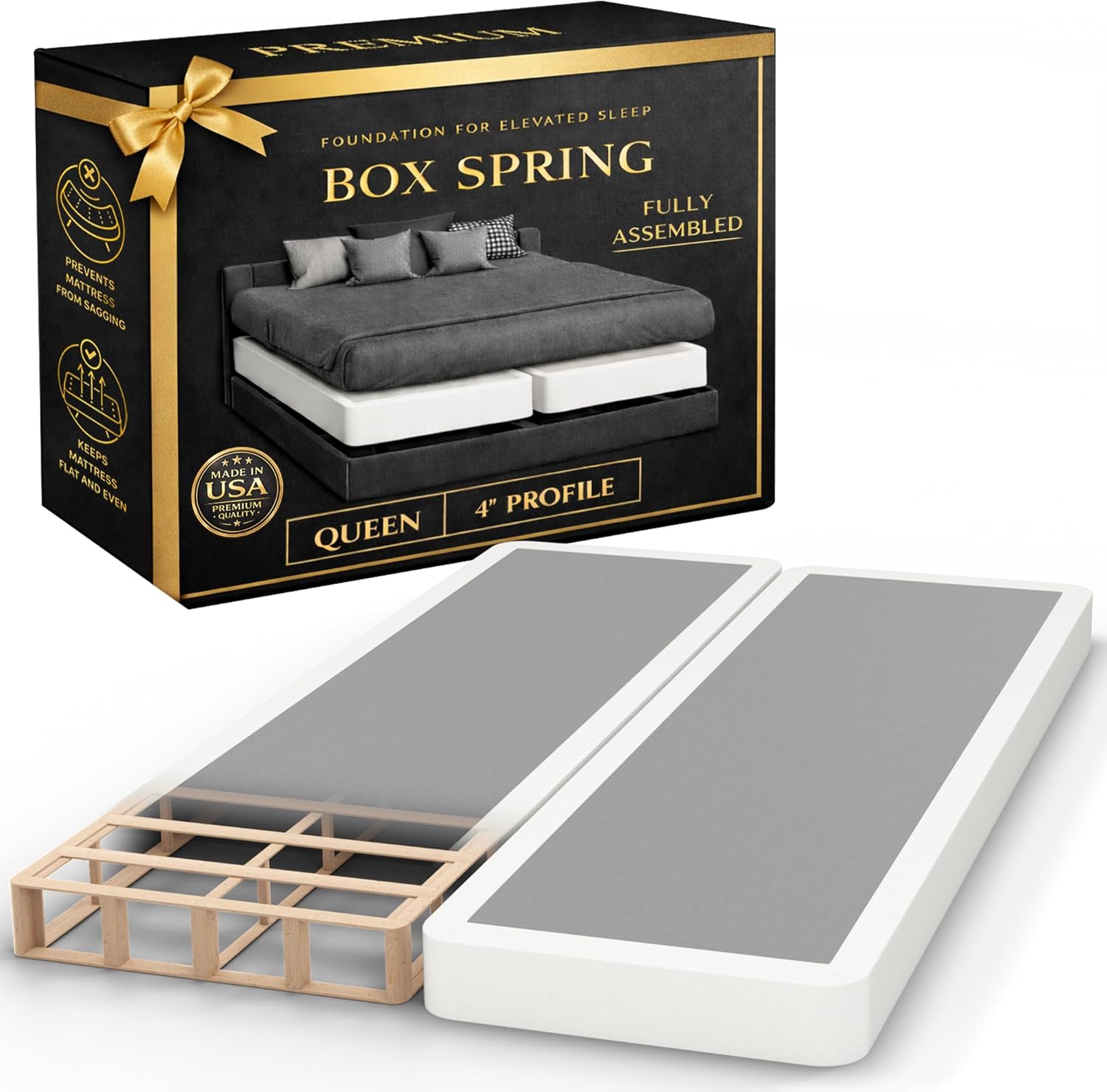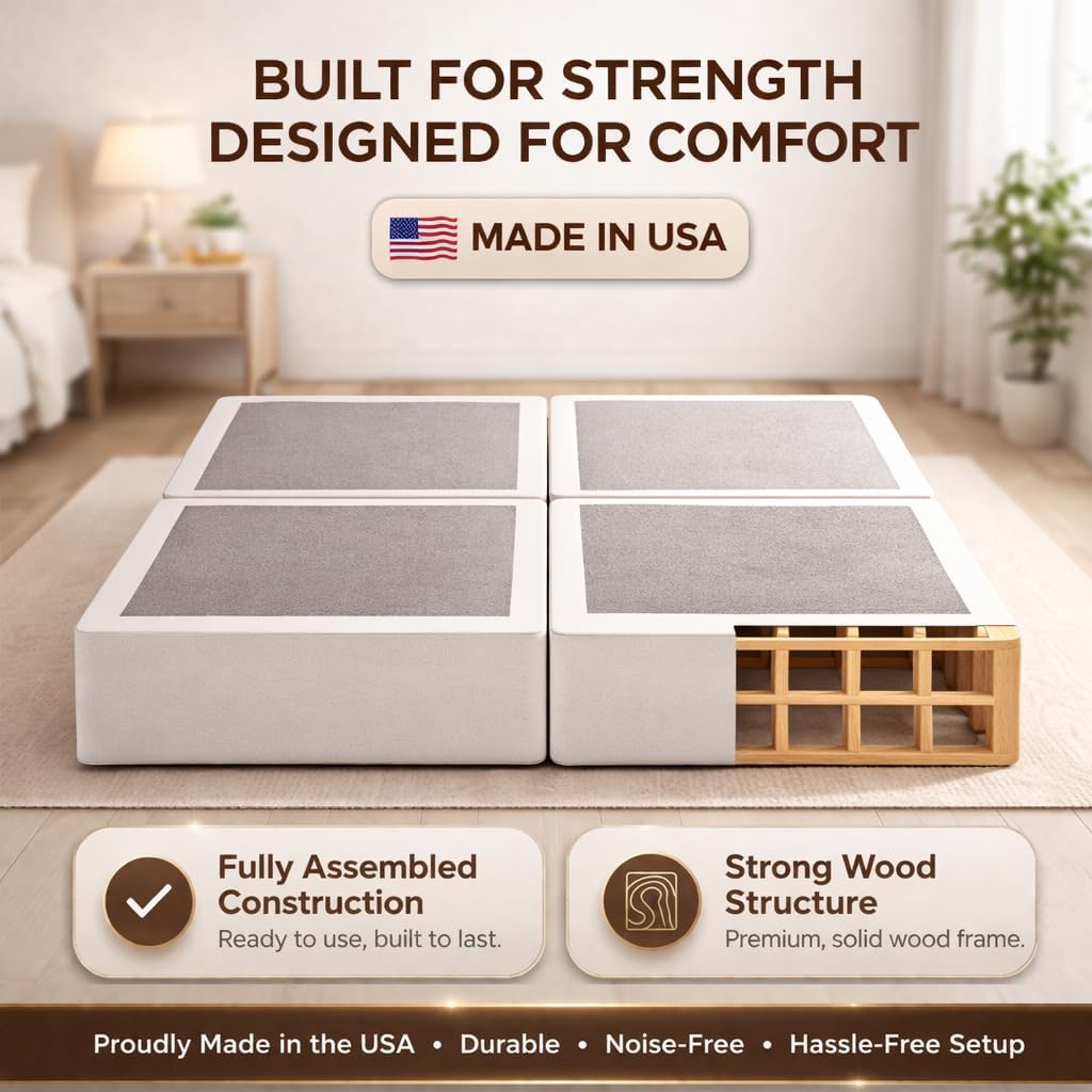 The right kind of smart box spring bed base can change everything & provide mattress comfort and stability. It’s the difference between deep sleep and restless nights. Between a mattress setup that fits easily through stairwells, and one that gets jammed halfway up the landing. Between moving in stress-free… and not at all.That’s why this fully assembled wood box spring was built for real life. Solid wood pieces, durable joints, and Amish craftsmanship come together to give your mattress the support it needs – without the headaches you don’t.Instead of stiff metal or squeaky materials, you get natural wood with just the right amount of give. It stays quiet through the night and comfortable under pressure, helping your mattress feel more supported.PRODUCT SPECIFICATIONS:Sizes: Twin, Twin XL, Full, Full XL, Queen, King, Queen(Fold), King(Fold), California King(Fold)Heights: 2"", 4"" or 8""Colours: White or GrayMaterial: Solid WoodAssembly: Fully AssembledOrigin: Amish-Made in the USAIncludes: Box Spring OnlySPLIT DESIGN FOR EASY TRANSPORTForget the frustration of cramming bulky box springs through doorframes. This comes in split pieces – able to fit through tight stairwells and be easily set up once in the room. Great for any setup, especially if space is limited.SOLID SILENT SUPPORTThe wood frame flexes just enough to be comfortable without creaking or shifting over time. It works with all mattress types like memory foam, latex, spring and hybrid—and gives you a stable, quiet base that stays supportive through the night. Strong support for your mattressMADE IN AMERICA BY THE AMISHThis box spring foundation is made in the USA by experienced Amish craftsmen who take pride in doing things right. From the quality of the wood to the precision of the joints – it’s built with care and built to last.One of the key benefits of this box spring is its ability to absorb pressure, which helps distribute weight evenly across the bed, reducing the amount of pressure on your back, neck, and other joints. Additionally, this box spring is available in a range of sizes and thickness options, including twin, twin XL, full, full XL, queen, king, queen(Fold), King(Fold)and California king(Fold), so you can choose the level of support that best suits your needs and also available in low profile bed base and high profile bed base.Plus, with its sleek and simple design, this box spring will complement any bedroom decor. It is available in two stylish colours, white and Gray, so you can choose the one that best fits your style. Durable frame with horizontal slats for strong mattress supportIn summary, our natural wood box spring is the perfect accessory for anyone who wants a durable, supportive, and fully assembled box spring for their mattress. With its ability to distribute weight evenly, it reduces pressure on your body and ensures a comfortable sleep. Choose from a range of sizes and thickness options and upgrade your bedroom with this must-have accessory today!