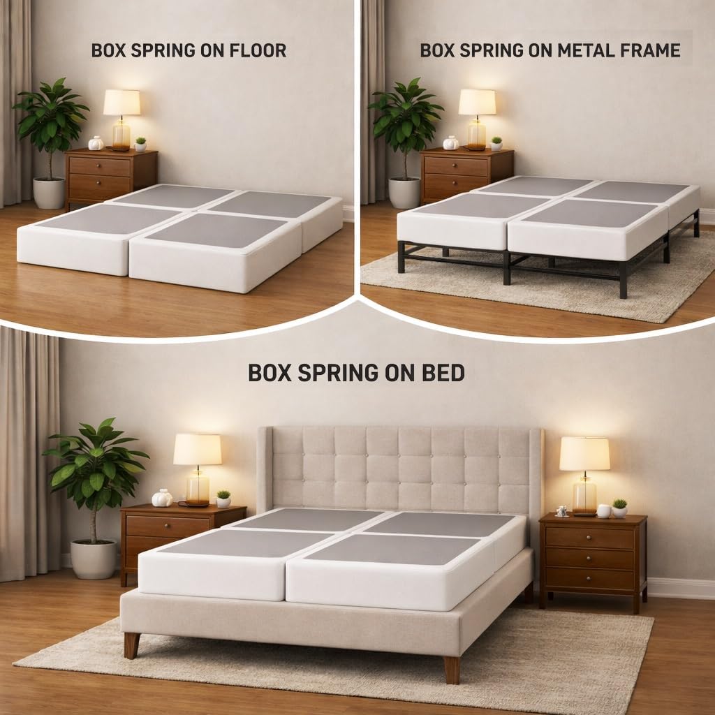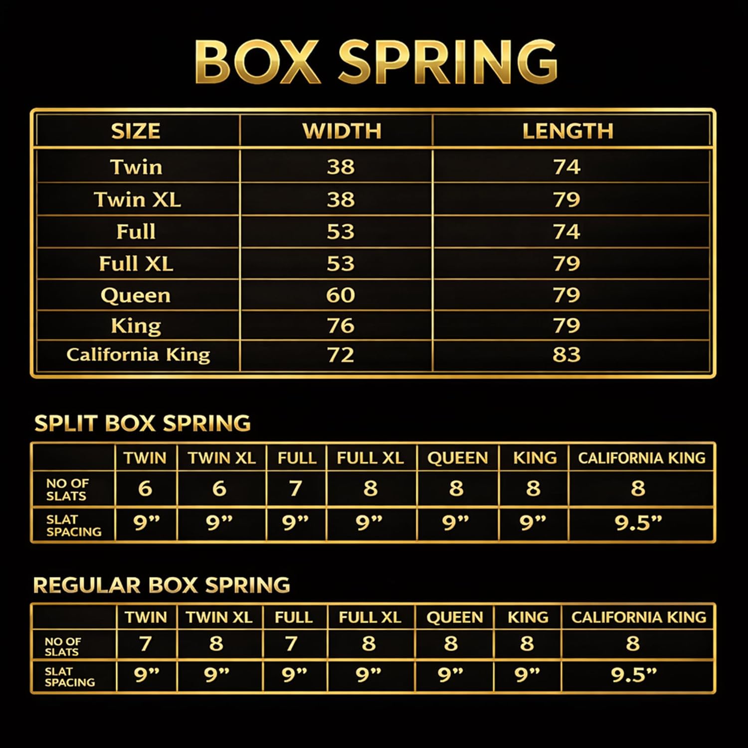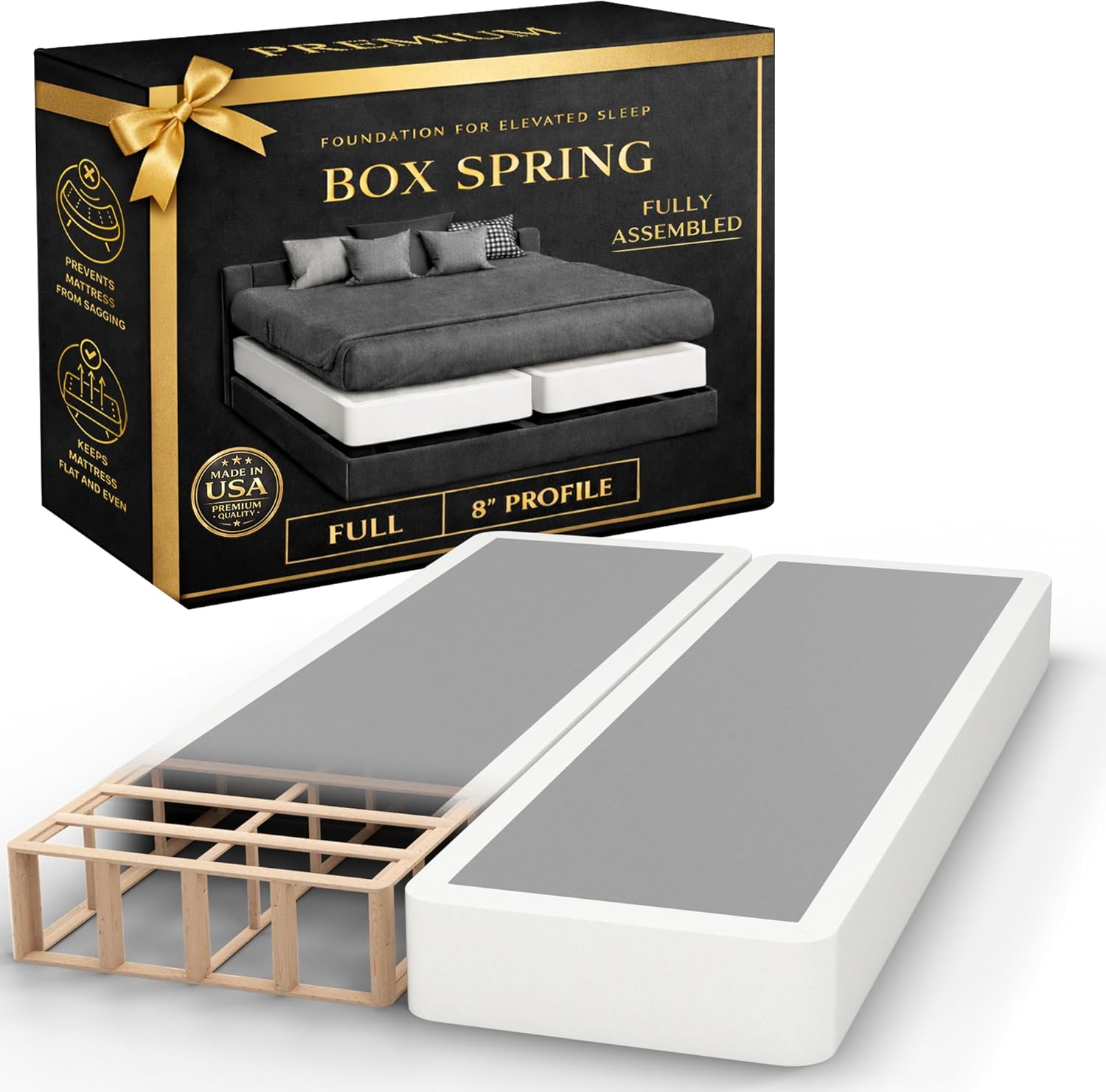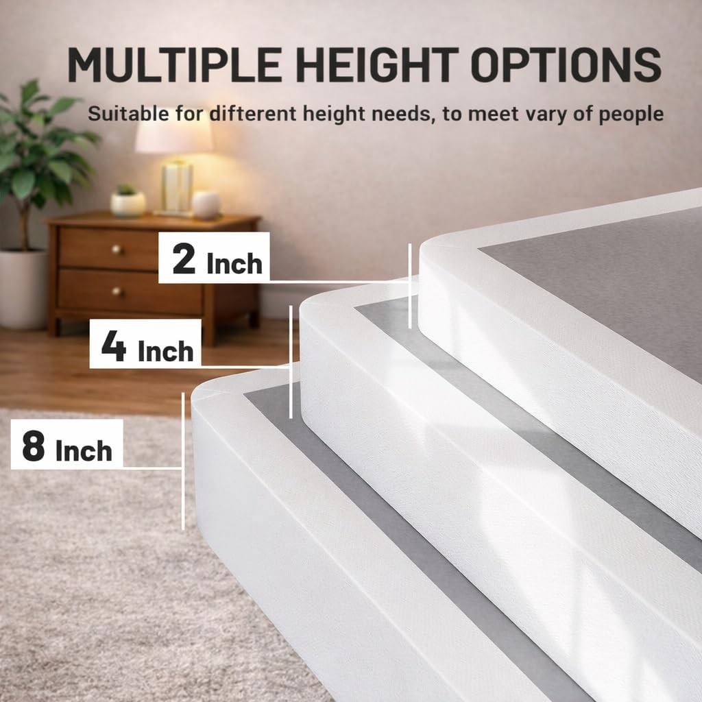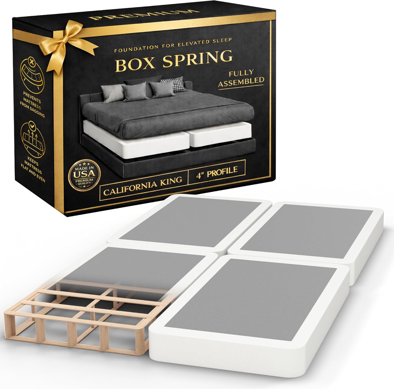 The right kind of smart box spring bed base can change everything & provide mattress comfort and stability. It’s the difference between deep sleep and restless nights. Between a mattress setup that fits easily through stairwells, and one that gets jammed halfway up the landing. Between moving in stress-free… and not at all.That’s why this fully assembled wood box spring was built for real life. Solid wood pieces, durable joints, and Amish craftsmanship come together to give your mattress the support it needs – without the headaches you don’t.Instead of stiff metal or squeaky materials, you get natural wood with just the right amount of give. It stays quiet through the night and comfortable under pressure, helping your mattress feel more supported.PRODUCT SPECIFICATIONS:Sizes: Twin, Twin XL, Full, Full XL, Queen, King, Queen(Fold), King(Fold), California King(Fold)Heights: 2"", 4"" or 8""Colours: White or GrayMaterial: Solid WoodAssembly: Fully AssembledOrigin: Amish-Made in the USAIncludes: Box Spring OnlySPLIT DESIGN FOR EASY TRANSPORTForget the frustration of cramming bulky box springs through doorframes. This comes in split pieces – able to fit through tight stairwells and be easily set up once in the room. Great for any setup, especially if space is limited.SOLID SILENT SUPPORTThe wood frame flexes just enough to be comfortable without creaking or shifting over time. It works with all mattress types like memory foam, latex, spring and hybrid—and gives you a stable, quiet base that stays supportive through the night. Strong support for your mattressMADE IN AMERICA BY THE AMISHThis box spring foundation is made in the USA by experienced Amish craftsmen who take pride in doing things right. From the quality of the wood to the precision of the joints – it’s built with care and built to last.One of the key benefits of this box spring is its ability to absorb pressure, which helps distribute weight evenly across the bed, reducing the amount of pressure on your back, neck, and other joints. Additionally, this box spring is available in a range of sizes and thickness options, including twin, twin XL, full, full XL, queen, king, queen(Fold), King(Fold)and California king(Fold), so you can choose the level of support that best suits your needs and also available in low profile bed base and high profile bed base.Plus, with its sleek and simple design, this box spring will complement any bedroom decor. It is available in two stylish colours, white and Gray, so you can choose the one that best fits your style. Durable frame with horizontal slats for strong mattress supportIn summary, our natural wood box spring is the perfect accessory for anyone who wants a durable, supportive, and fully assembled box spring for their mattress. With its ability to distribute weight evenly, it reduces pressure on your body and ensures a comfortable sleep. Choose from a range of sizes and thickness options and upgrade your bedroom with this must-have accessory today!