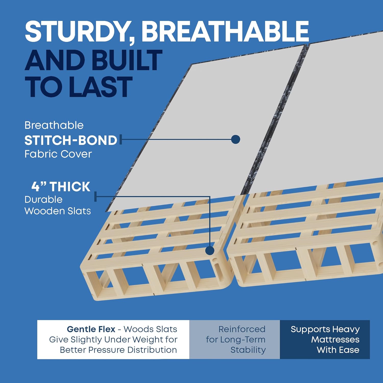 This premium box spring is crafted from strong and heavy-duty Canadian Rubber Wood, known for its light yet dense structure, which ensures long-lasting durability and keeps your mattress in pristine condition. The innovative design allows for easy transport by splitting the box spring into four manageable sections, making it effortless to move.Designed for convenience, this box spring arrives fully assembled—simply open the box, attach the legs, and it's ready for immediate use. Its optimal height enhances your mattress, providing the perfect balance of comfort and support.This box spring with legs is specifically engineered to support memory foam and hybrid mattresses, offering a sophisticated and elegant look. Built to last, this box spring guarantees durability and longevity.Ideal for all mattress types, particularly those with 8" and 4" heights, it is perfect for individuals who prefer a low-profile bed. Crafted in the USA from high-quality, responsibly sourced wood, this box spring features a non-slip surface to keep your mattress securely in place, ensuring a stable and restful sleep experience.