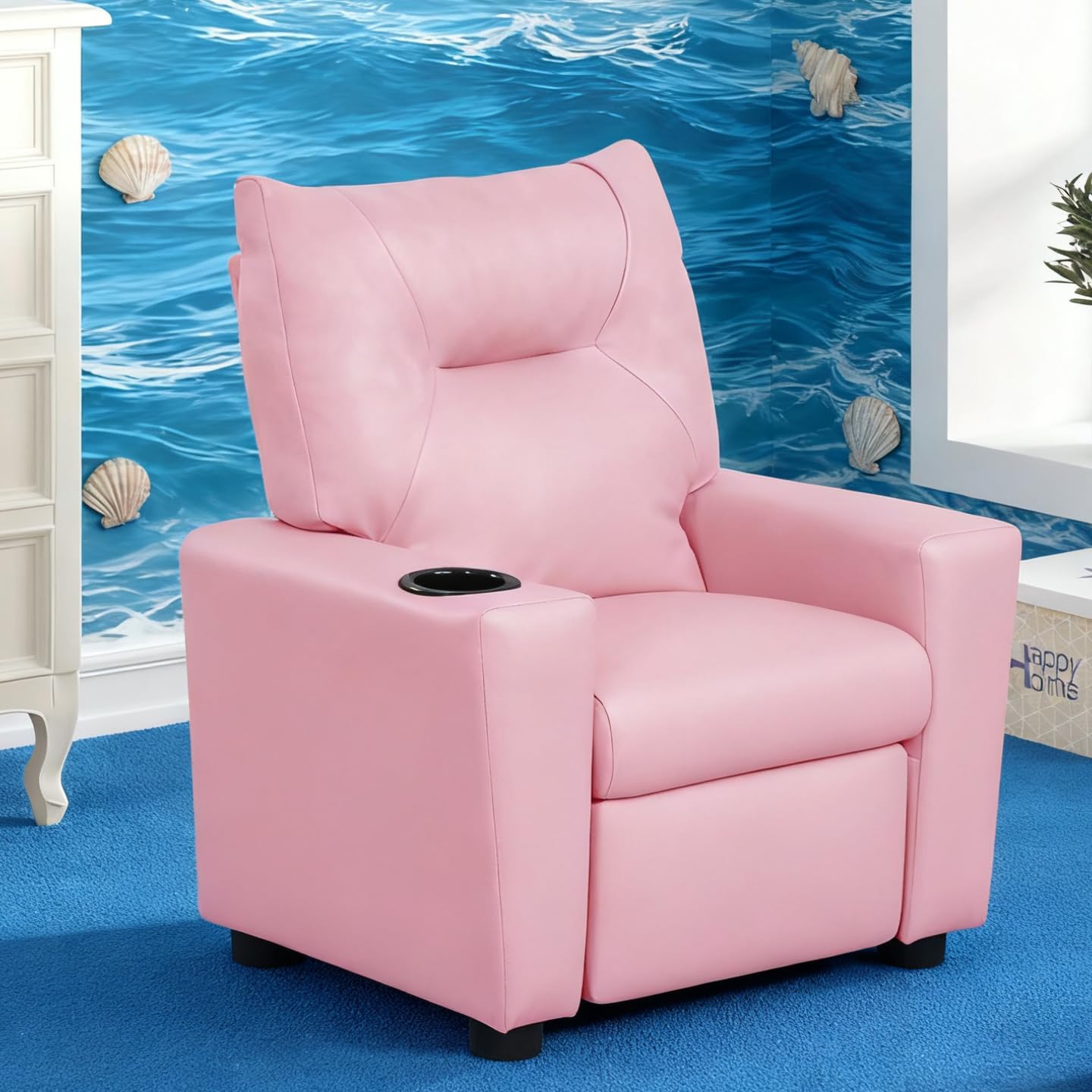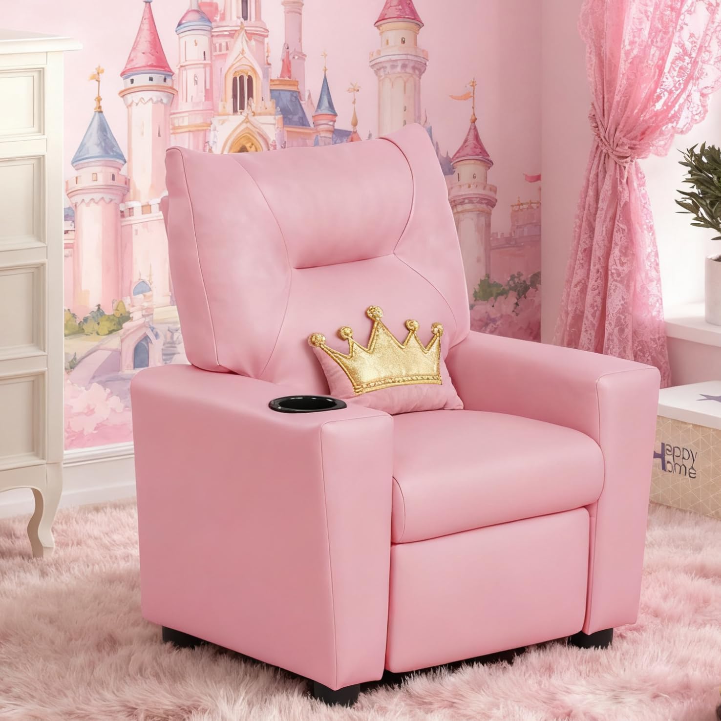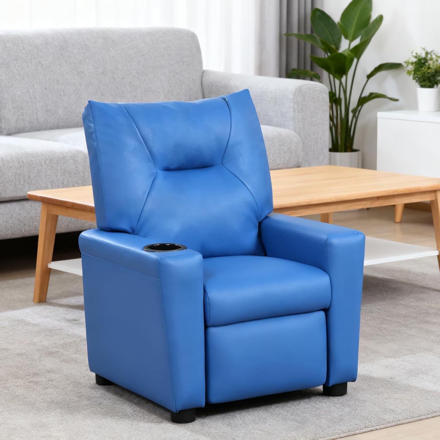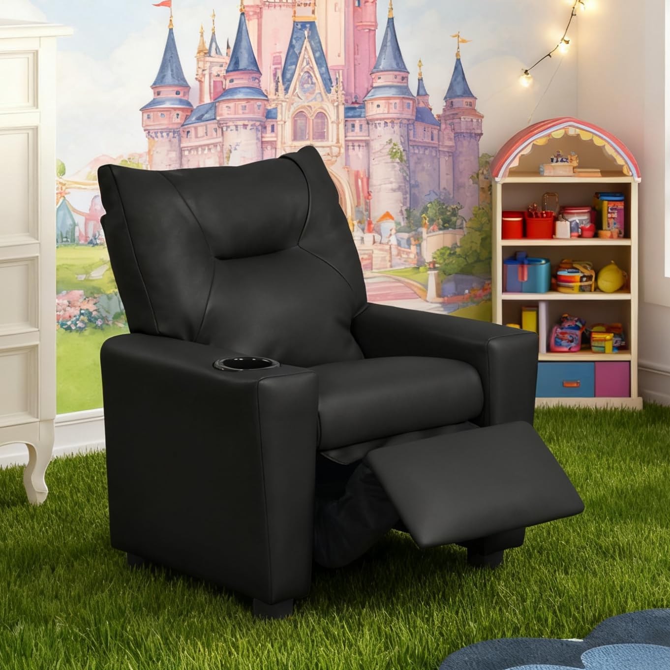 Product featuresYouth Recliner ChairCup Holder13" Seat Height13" Seat Width11" Seat Depth17" Arm Height15" Seat Back Height2" Leg HeightBlack Plastic Leggraphic descriptionThe Perline Kids Recliner Chair is designed to provide comfort and style specifically for children. This sleek recliner is made with quality PVC fabric, which offers a luxurious look and is easy to clean—perfect for any child’s room or living space. The chair features a built-in cupholder, allowing your child to keep their favorite drink close at hand while they enjoy reading, watching TV, or just lounging. The reclining function ensures that your child can sit upright or lean back for added comfort. Ideal for both relaxation and fun, the Perline Kids Recliner Chair is the perfect addition to any home looking to combine functionality with a stylish design tailored for younger users.