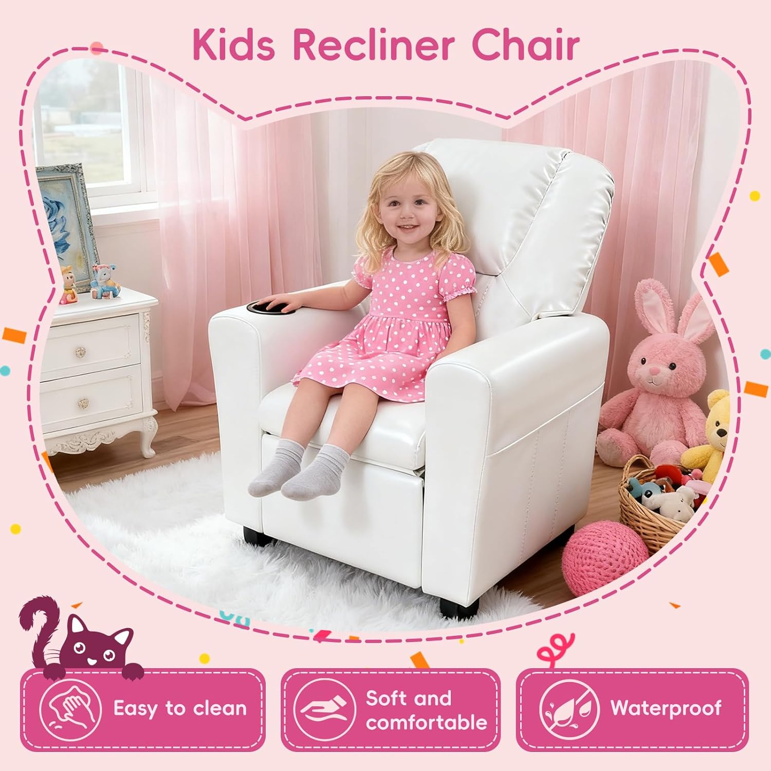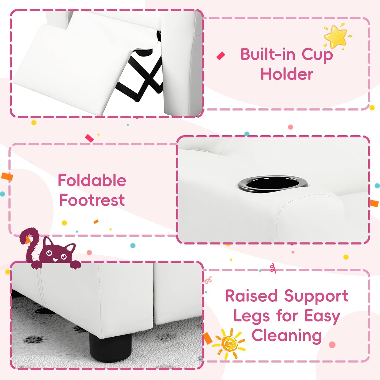 This kids recliner chair is thoughtfully designed to provide toddlers with their own relaxing space while matching the style of modern family homes. ---The thick padded seat, backrest, and armrests create a supportive environment for everyday activities such as reading, screen time, and quiet play. A built-in cup holder adds convenience, letting kids keep their favorite drinks or small snacks nearby.---Its lightweight yet stable structure makes it easy to move from the living room to the bedroom or play area. With its clean, modern look, this children’s reclining chair fits seamlessly into nurseries, kids’ rooms, and family spaces.An ideal seating choice for toddlers who enjoy having “their own” special chair.