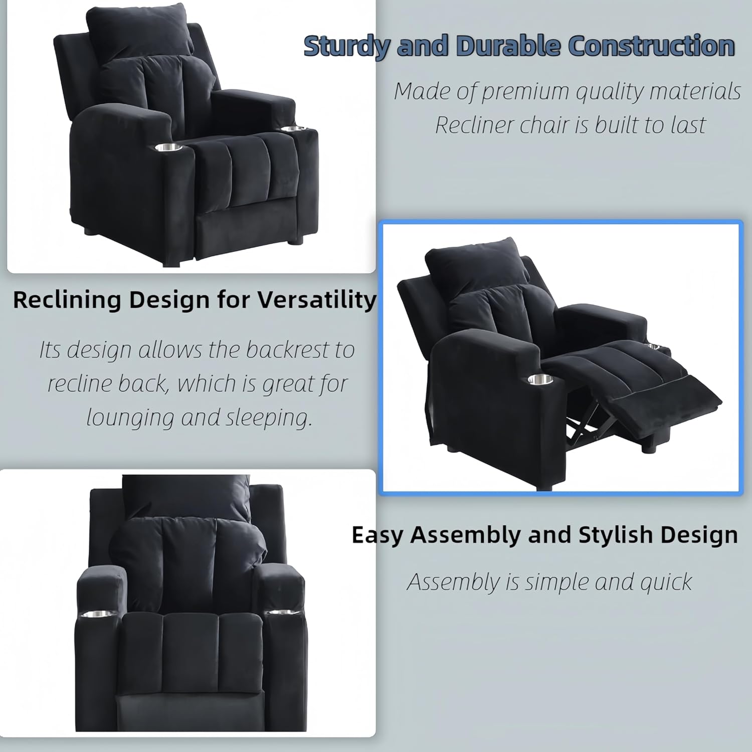 [ 1: Two Cup Holder for Easy Access]This kids recliner features two built-in cup holders, perfect for holding drinks and snacks while lounging in a cozy living room recliner or bedroom nook. Designed with easy reach accessibility, kids can sip and snack comfortably without leaving their seat, mimicking the convenience of a lazy boy recliner chair . [ 2: Headrest & Footrest for Ultimate Comfort]The plush velvet headrest and footrest provide superior support, creating a luxurious lounging experience akin to high-quality living room recliners. Kids can recline effortlessly, sink into the cushioned seat, and unwind after a busy day of play . [ 3: Durable Construction for Long-Lasting Use]Crafted from premium materials like solid wood and velvet fabric, this small recliner withstands enthusiastic play. Its sturdiness rivals that of a lazy boy recliner chair, promising years of reliable service in any room, from kids' bedrooms to living areas . [ 4: Versatile Reclining Design with Weight Limit]With an ergonomic reclining mechanism, this kids recliner adjusts smoothly from upright to fully laid-back positions. Featuring a 150LBS weight capacity, it accommodates growing children while maintaining the cozy feel of a premium couch, ideal for naps or storytelling sessions . [ 5: Child-Sized Ergonomics for Growing Needs]Specially designed for toddlers and young children, this recliner offers child-sized dimensions and padded backrest, headrest, and footrest, providing a perfect fit for their small frames. The plush velvet upholstery adds a touch of luxury, making it a cozy spot for reading, napping, or simply relaxing .