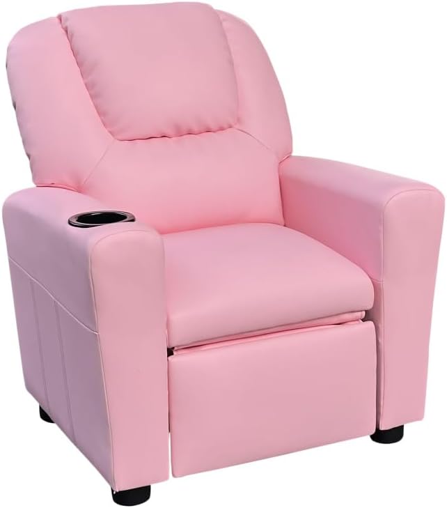 Enhance your child's room with this stylish and functional 23-inch youth recliner chair, expertly designed for comfort and durability. Covered in premium black PU leather, this compact recliner resists spills and everyday wear, making it ideal for active kids and easy to clean with just a damp cloth. The chair features a built-in cup holder, perfect for keeping drinks or snacks close during movie time, gaming, or reading. Its ergonomic design supports healthy posture with a contoured seat and backrest that recline smoothly for customized relaxation. Measuring 14.2 inches in seat height, 14 inches in seat width, and 10.6 inches in depth, this small recliner fits perfectly in kids' rooms, playrooms, or teen lounges. The arm height is 16.9 inches, offering comfortable arm support, while the 16.5-inch backrest provides ample upper body comfort. Equipped with sturdy black plastic legs and a non-removable cushioned seat and back, this durable accent chair offers long-lasting use. Available in multiple color options to match various home decors, it’s a practical and modern seating solution for children and teens alike.