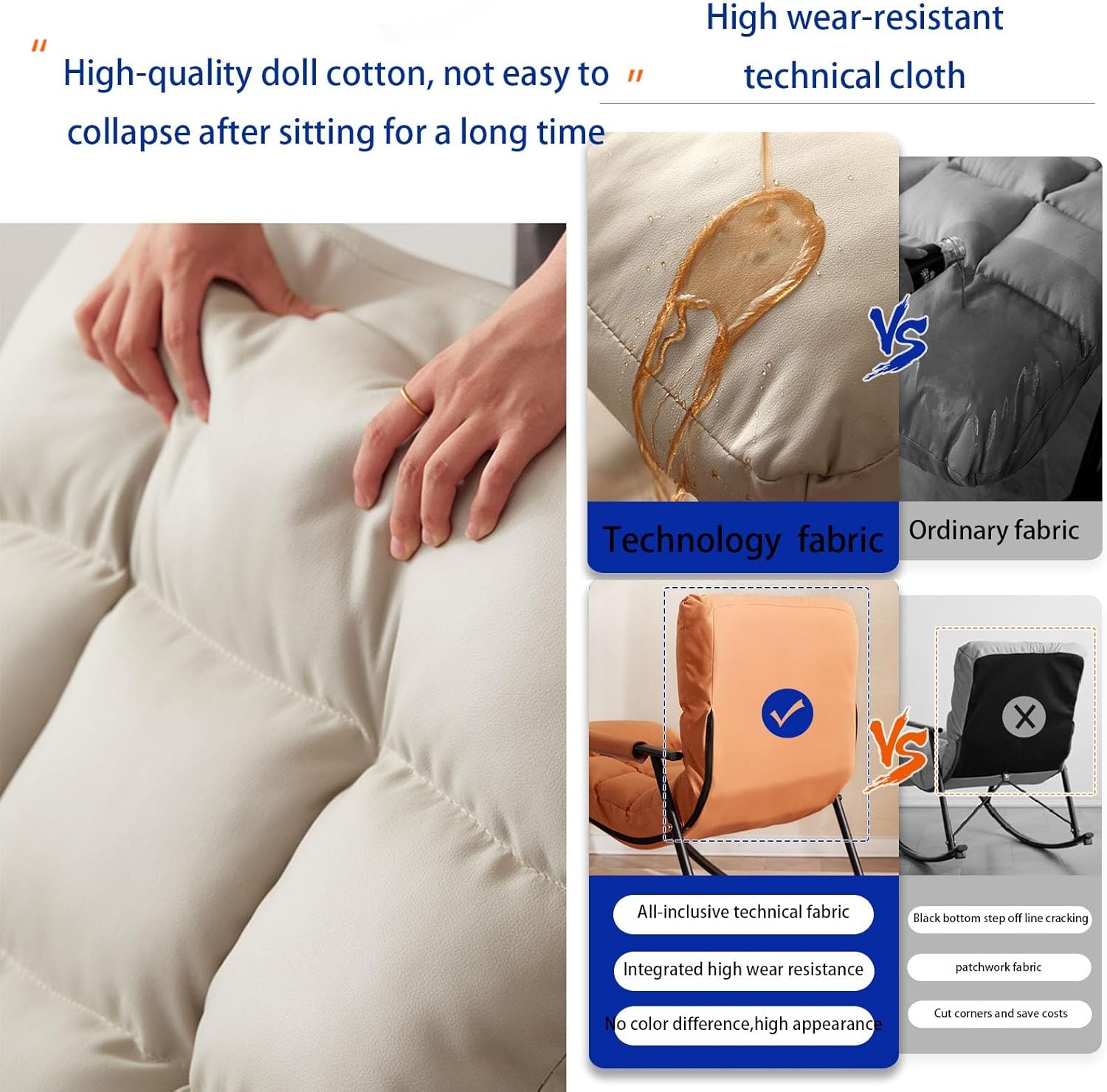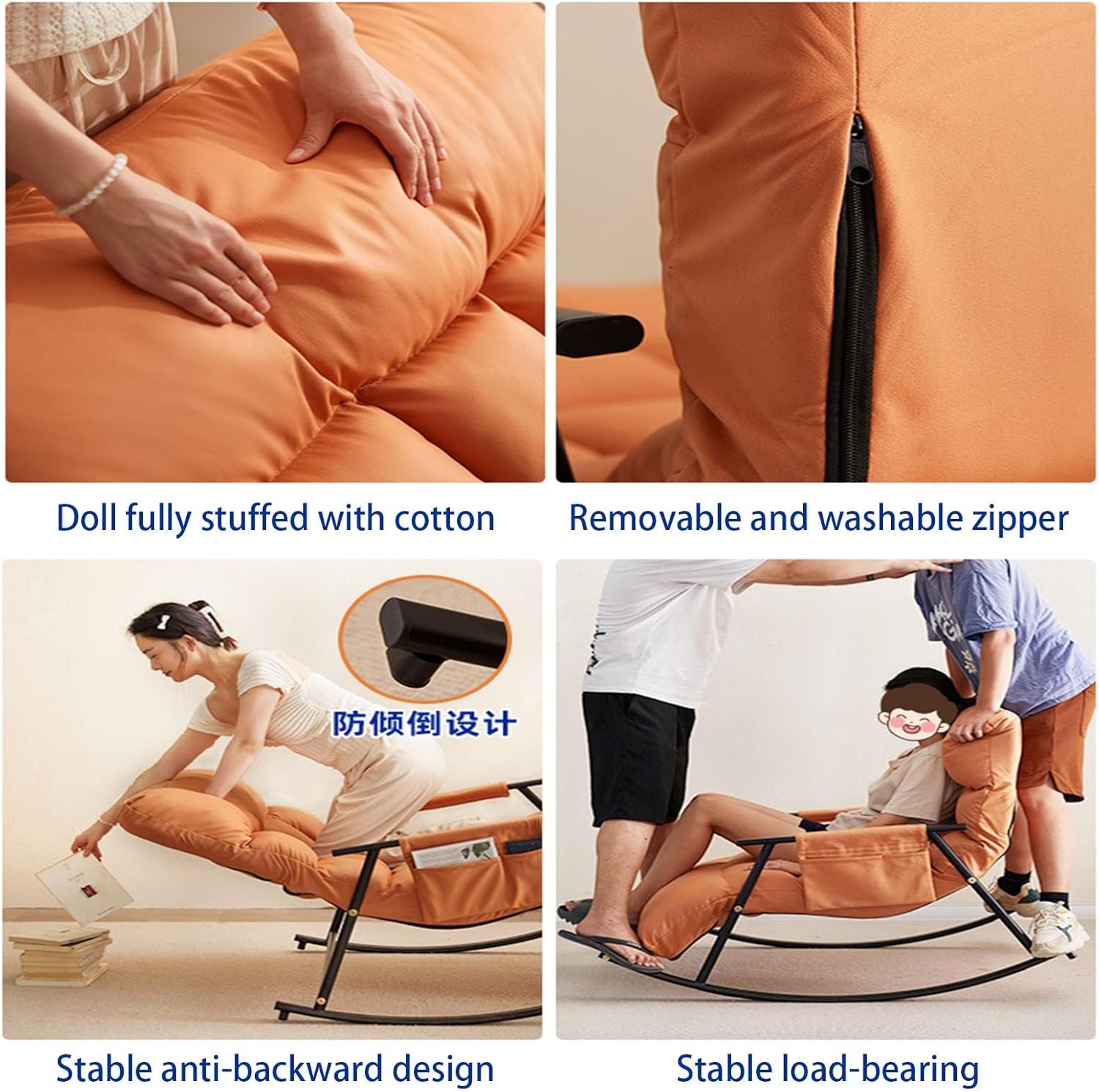 Introducing our Adjustable Rocking Chair, a versatile outdoor patio furniture piece designed for ultimate comfort and relaxation. With six adjustable positions for both the backrest and footrest, this bedroom chair caters to your customized comfort needs. Whether you prefer to sit upright, recline, or even lie flat, our comfy chair adapts effortlessly, making it ideal for reading, napping, or unwinding after a long day.[Name]: rocking chair[Material]: Carbon steel frame + high wear-resistant technical cloth (removable and washable)[Load capacity]: 200kg/440lbs[Color]: orange, yellow, blue, green, white, gray[Can be used as]:lounge chair,chairs for bedrooms,camping chairs for adults,living room chair,outdoor chair,rocking camping chair outdoor,outdoor rocking chairs,comfy chair for bedroom.Durability is key, and our lounge chair is built to withstand the test of time. The high-density carbon steel frame provides an exceptional support system, ensuring stability and strength for individuals weighing up to 200kg/440lbs. Not only does it offer robust support, but it also boasts corrosion and wear resistance, making it suitable for outdoor use.We understand the importance of convenience, which is why our living room chair comes equipped with thoughtful features. Armrest storage bags are included, allowing you to keep essentials like books, magazines, or your phone within arm's reach. Plus, enjoy a noiseless rocking experience thanks to the included dampening stickers. Experience the epitome of comfort and style with our Adjustable Rocking Chair. Whether placed on your patio, in the garden, or even in your living room, it's bound to become your go-to spot for relaxation. Invest in a piece of outdoor furniture that prioritizes your comfort and well-being. Upgrade your lounging experience today!