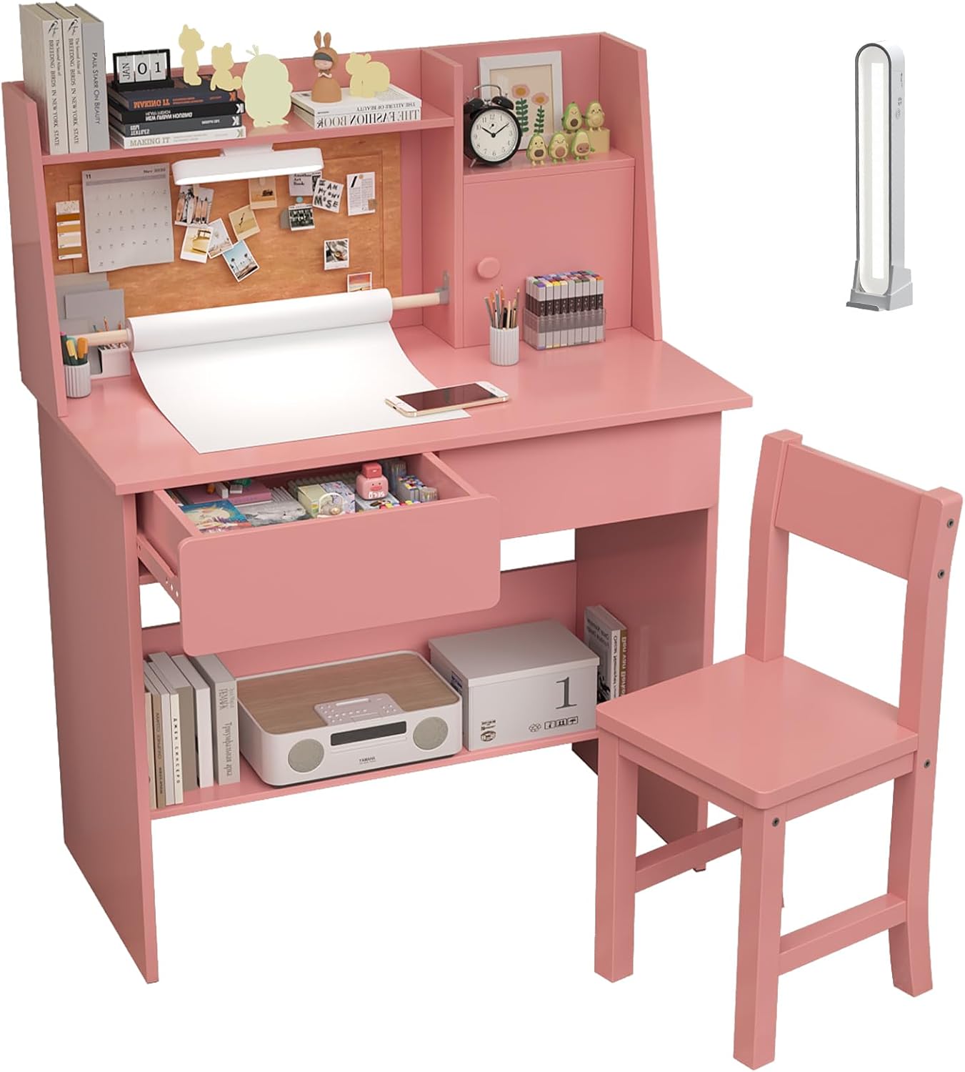 Pink Wooden Kids Study Desk and Chair Set, Childrens Desk with Light and Paper Roll Rack, 2 Drawers,Storage Cabinets and Shelves, Boys & Girls Study Desk for Bedroom and Kidsroom