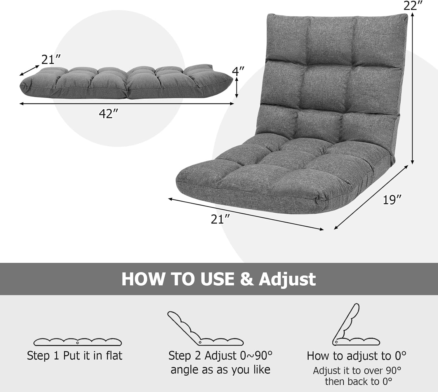 | Additional Features | Grey floor chair, adjustable Video Gaming Chair, floor chair for adults, floor seat chair for kids, lightweight floor chair |