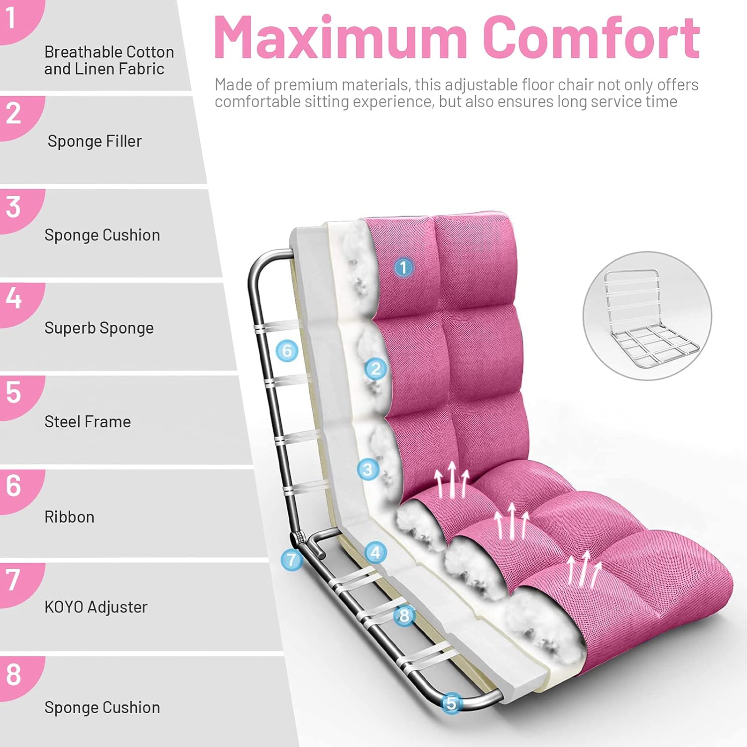 DescriptionEnjoy life and relax yourself with our folding lazy floor gaming chair. Our folding sofa chair is made of heavy duty steel frame, high quality recycled sponge and skin-friendly linen fabric for durability. Thickened high-density sponge gives you a comfortable sitting capital lying sleeping experience. Not only is this floor seating for adults ideal for sitting on the floor when watching TV, for sitting outside to get some sun, and for playing board games on the floor, but it's also perfect for a reading nook in your kids' room.FeaturesEasy to use, no assembly requiredAs a great gift for your family and friendsHeavy-duty steel frame and for stability and durabilityStylish appearance perfectly matches your home decorStrong hinges remain chair upright without leaning against a wallLightweight convenient to move, folding lie flat for easy storageIdeal for playing games, watching TV, coloring, reading, meditationSpecificationColor: Blue/Black/Pink/Gray/TurquoiseMaterial: Metal, Sponge, Linen FabricFlat Dimensions: 42" x 21" x 4"/ 106.5 x 55.5 x 10 cm (L x W x H)Weight Capacity: 264 lbs/120 kgNet Weight: 8.5 lbs/4 kgPackage Included1 x Floor Chair1 x Manual