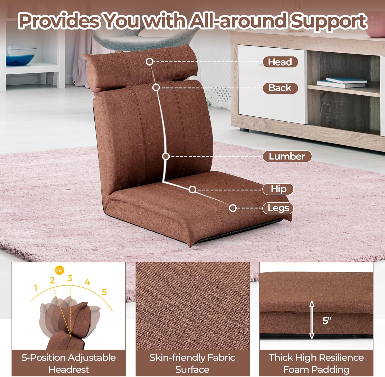 Description: Discover unparalleled comfort and versatility with our innovative folding floor chair. Customize your seating experience with the 14-level adjustable backrest and 5-level adjustable headrest, ensuring optimal positioning for reading, gaming, or working. The soft linen fabric upholstery, along with plush sponge filling, provides a cozy and relaxing seating experience that ensures lasting comfort and support. Supported by a heavy-duty metal frame, this chair offers a stable foundation capable of accommodating up to 330 lbs. Transforming effortlessly into a floor chair, lounger, or bed, this versatile piece is suitable for any room in your home, from the living room to the dorm. The sleek and modern design adds a stylish touch, while the space-saving flat design allows for easy storage when not in use. Elevate your relaxation experience with this multi-functional and dependable floor chair. Features: 14-level adjustable backrest for personalized comfort 5-level adjustable headrest for optimal relaxation Soft linen fabric upholstery for a cozy sitting experience Sponge filling for improved comfort and support Versatile design functions as a floor chair, lounger, or bed Heavy-duty metal frame supports up to 330 lbs Sleek and modern design adds a stylish touch to your space Space-saving flat design for convenient storage Suitable for various settings like living rooms, playrooms, or dorms Specifications: Color: Brown Material: Metal, Linen Fabric, Sponge Product Dimensions: 24.5" x 31" x 30.5" (L x W x H) Lay Down Dimensions: 56.5" x 24.5" x 5" (L x W x H) Net Weight: 13 lbs Weight Capacity: 330 lbs Package includes: 1 x Folding Sofa Chair 1 x User Guide Why You Choose Our Folding Sofa Chair? 14-level adjustable backrest and 5-level adjustable headrest for personalized comfort. Soft linen fabric upholstery for durability and relaxation.