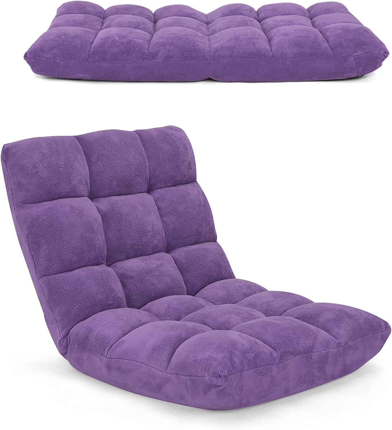 Description: This floor chair is perfect for playing games, reading books, watching TV or resting. It can be used as a chair or bed. With the durable and sturdy iron frame, the back can be easily adjusted to 90 degree from flat to upright and withstands weight up to 200Lbs. Features: Adjust into 14 different positions from 90 to 180 degree High quality chopped memory foam and soft plush fabric Can be used as a chair, a couch or a bed Suitable for playing games, watching TV, reading or meditate Lay the chair completely flat to store under your bed or tall couch It is lightweight and easy to carry Delivered fully assembled Specification: Flat position dimensions: 41.5 in x 22 in x 6 in (L x W x H) 90 degree position dimensions: 26.5 in x 22 in x 22 in (L x W x H) Adjustable angle: 90 - 180 degree Net weight: 13.5 lbs Weight capacity of back: 200lbs Package include: 1 x Floor Chair