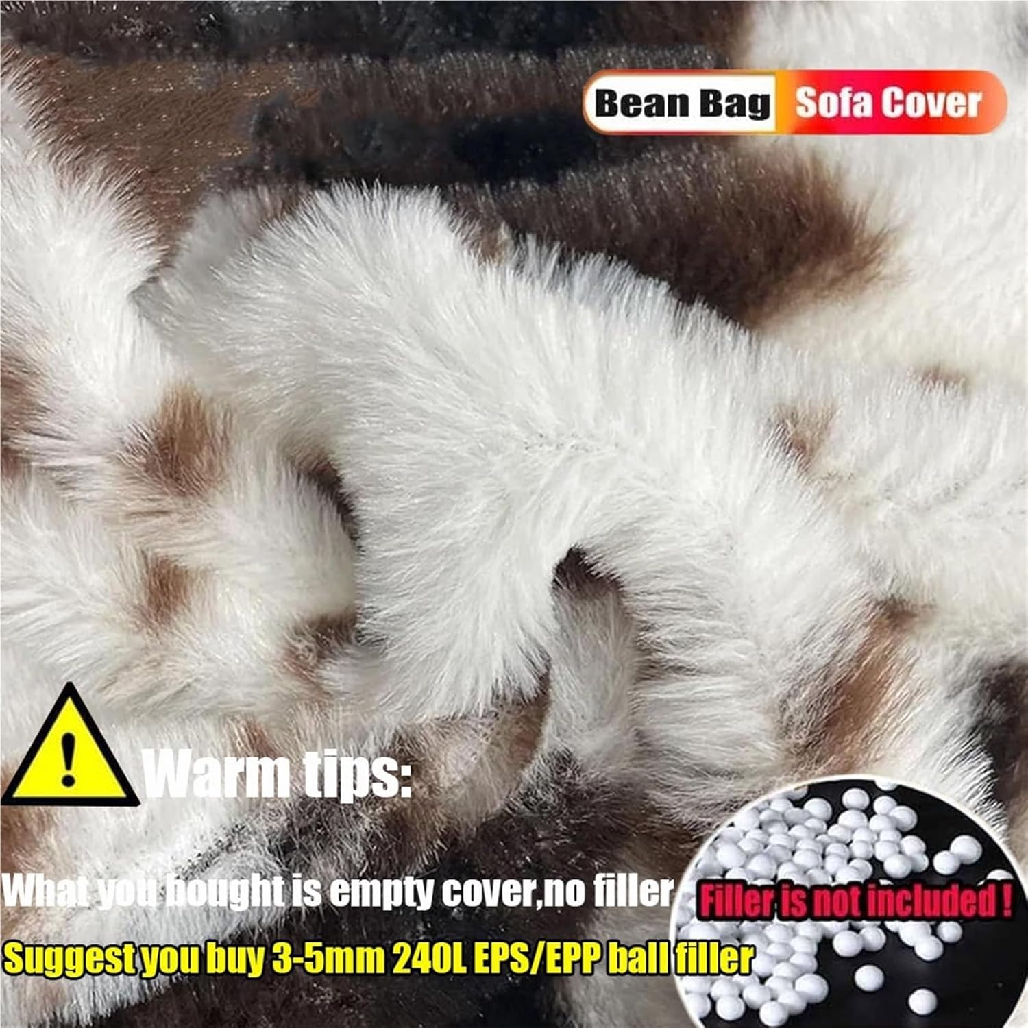 Pre-purchase instructionsAbout filler:This purchase link price isJust Sofa over,Without Filler !!!!!!!You need fill the filler by yourself..45cm stool cover-Need fill about (70L)EPS beads About materials:The cover is made of high quality thick faux bunny furAbout size:As details,the size is measured when it filled,please don't measure the size when it was empty.Manual measurement, please allow an error of 1-3cm.Packing:Bean bag cover (without filler)
