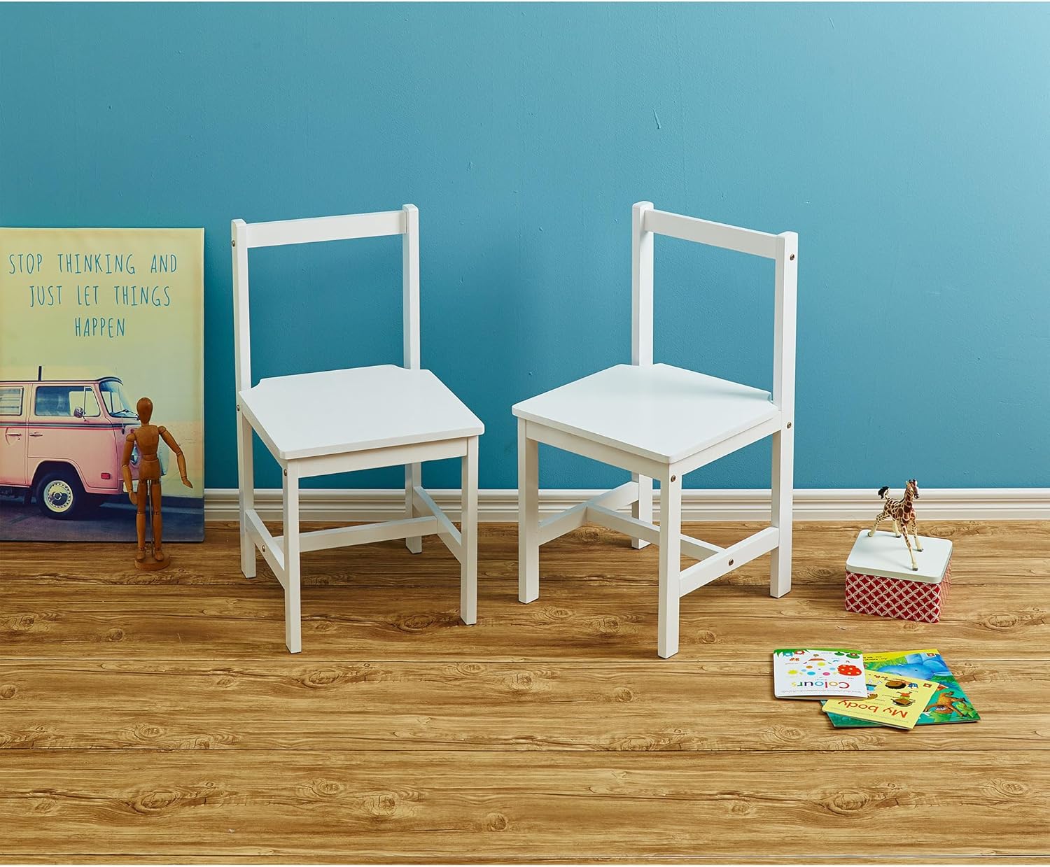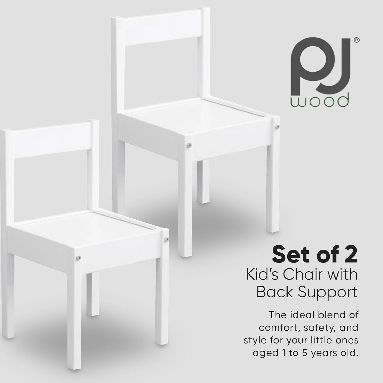 Make use of this Set of 2 PJ Wood's Kids Chair, the ideal blend of comfort, safety, and style for your little ones aged 1 to 5 years old. Crafted with meticulous attention to detail, these chairs feature a top rail back support, ensuring optimal spinal alignment for growing bodies. With dimensions of 11 by 11 by 19 inches and 14.15 pounds, these children's chairs are perfectly proportioned for little users to withstand playful antics. In a charming white color, this chair set effortlessly complements any home décor or classroom setting, adding a touch of sophistication to children's spaces. Whether for mealtime, craft activities, or story sessions, these toddler chairs provide a cozy spot for kids to comfortably sit and engage in various activities. These modern chairs are not only about safety; they also exude elegance and charm with their sleek design and modern aesthetic. Ensuring comfort and longevity, these bedroom chairs are a worthwhile investment for any home. With their ergonomic features and comfortable seating, children can enjoy mealtime or playtime with ease, while parents can relax knowing their little ones are well-supported and protected. PJ Wood Kids Chairs are essential to any home, school, or playroom environment. Their ergonomic design, durable build, and timeless white color offer a comfortable and stylish seating solution for children's activities, making every moment memorable and enjoyable.