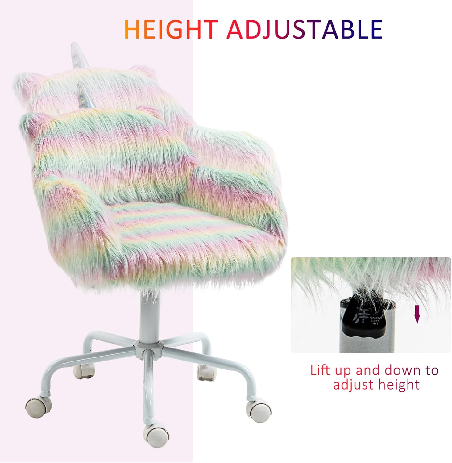 Add a touch of magic to your workspace with the Unicorn Office Chair. This delightful chair features a whimsical unicorn design that's sure to brighten any room. Crafted with a soft and plush faux fur covering, this chair offers exceptional comfort for hours of sitting. The wide, curved back and padded armrests provide additional support for a comfortable and ergonomic posture. Featuring a sturdy 5-star base with smooth-rolling casters, this chair allows for easy 360-degree swivel and effortless movement. Adjust the seat height to your preference using the easy-to-use pneumatic lever, ensuring a perfect fit for users of different heights. Whether used for studying, gaming, or simply relaxing, the Unicorn Office Chair is the perfect blend of style, comfort, and functionality. Overall Dimension: 21.25" W x 19.75" D x 25.25-28.25" H Weight Capacity: 264 lbs.
