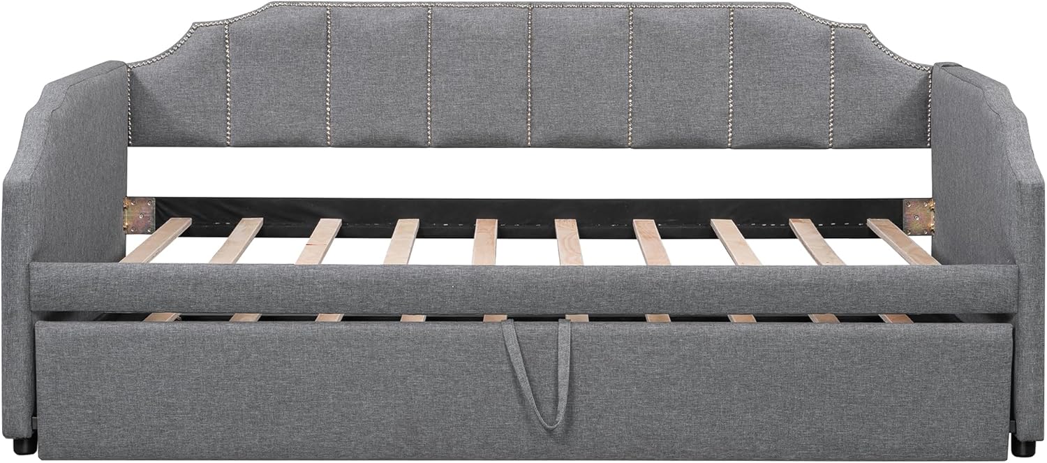 Hosting guests last minute and worried they won’t have a comfy place to sleep? No stress—this twin daybed pops up with a hidden trundle to give you an instant king-size sleeping space, perfect for surprise visitors or kids' sleepovers without needing an extra room. Tired of hunting for an outlet while you're relaxing or working from bed? Stay cozy and connected—the built-in USB ports on the armrest let you charge your phone or tablet right where you are, no extension cords needed. Worried about sharp corners or flimsy frames in a busy family room? This sturdy wood frame has smooth, rounded edges and holds up to 400 lbs, so you can relax knowing it’s safe, solid. Dreading complicated assembly with missing tools and confusing steps? Set-up is a breeze—everything you need is included, and the clear instructions get you from box to lounging in no time. Want a stylish piece that actually keeps you cool and comfy? The soft, breathable linen upholstery adds a modern touch to any room while helping you stay comfortable all year round—no box spring required.