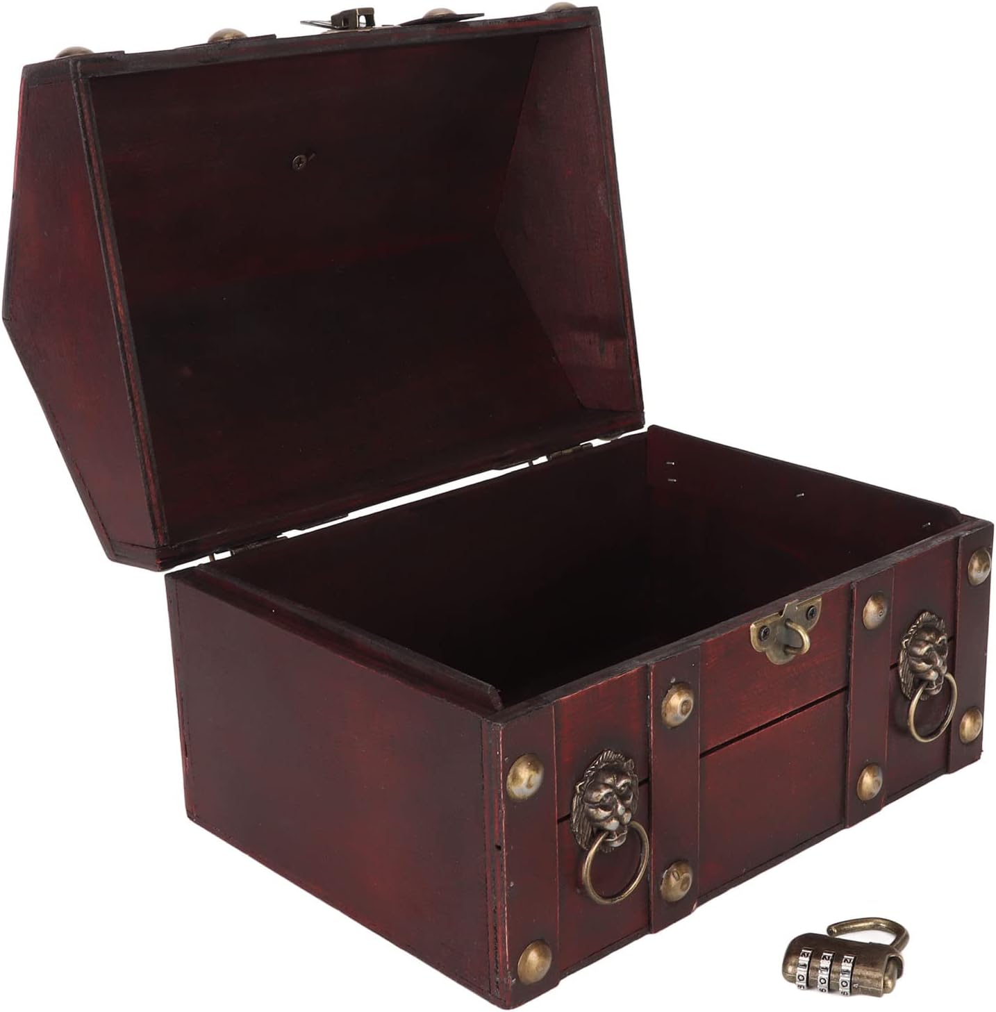 Specification Item Type: Treasure Chest Storage BoxMaterial: Solidly Wood, MetalProduct Use: For Jewelry Storage Box, Miscellaneous Dustproof Wooden Box, Desktop Storage BoxSize: Approx. 18 x 17 x 24cm / 7.1 x 6.7 x 9.4inPackage List 1 x Treasure Chest Storage Box1 x Combination Lock