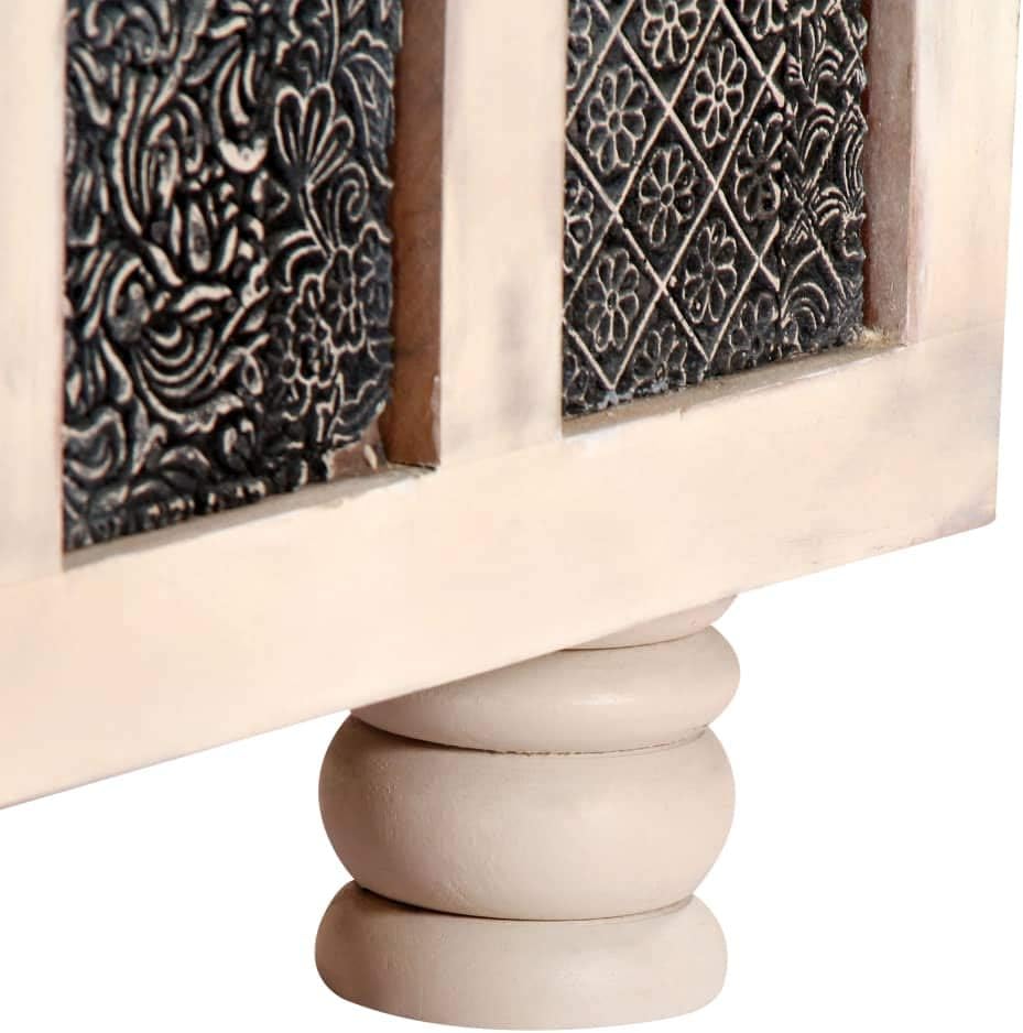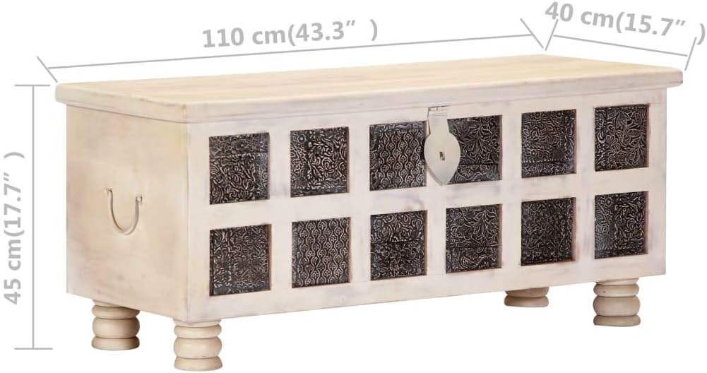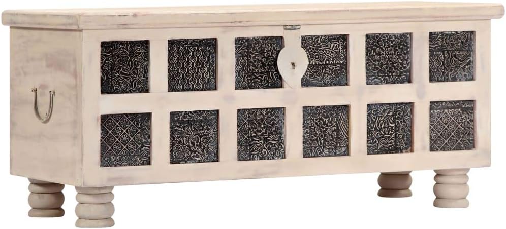 This unique wooden storage box, which combines a stylish look with functionality, will be a real eye-catcher in your living space.This storage chest is made of solid acacia wood, a tropical hardwood with beautiful grains, enabling the box exceedingly durable and hardwearing. It provides ample storage space for organising various items. Thanks to its stable flat top, this chest can also be used as a coffee table where you can place your drinks, vases as well as other decorative items.The exquisite craftsmanship and the beautiful wood grains make every piece of furniture unique and slightly different from the next.Color: WhiteMaterial: Solid acacia wood with white paintedDimensions: 43.3" x 15.7" x 17.7" (L x W x H)Polished, distressed and hand paintedWith ample storage spaceDecorated with caved panels