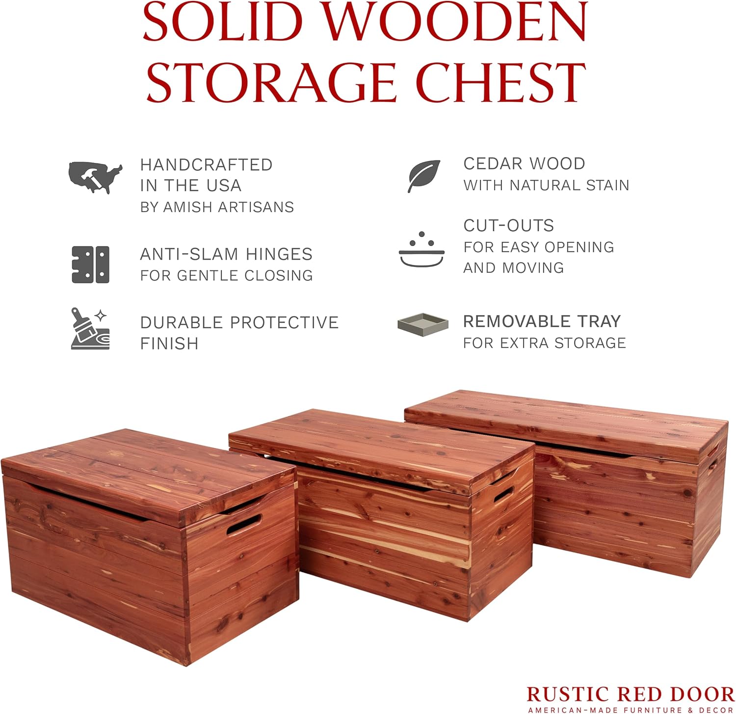 The Palmer Cedar Wood Chest with Tray is a perfect blend of timeless craftsmanship, durable construction, and rustic character. Handcrafted by skilled Amish artisans in the USA, this solid hardwood storage chest is built to last for generations. Each piece showcases the natural beauty of the cedar wood, offering rich texture and smooth grain patterns that make every chest truly one-of-a-kind. The tray provides extra storage for your smaller treasures, keeping them safe. Designed with both beauty and functionality in mind, the Palmer Chest features anti-slam soft-close hinges that allow the lid to close gently and safely, preventing sudden drops and protecting fingers. This thoughtful detail adds a refined, high-end touch while making everyday use safer and quieter. Our Palmer chests include cutouts for easy opening and closing while preventing injuries Finished with a pre-catalyzed polyurethane coating, this chest is exceptionally resistant to moisture, scratches, and wear. Perfect for keeping your furniture looking beautiful even in high-traffic areas. Whether used as a blanket chest in the bedroom, a storage trunk in the living room, or an accent piece in an entryway, the Palmer Cedar Chest delivers style, durability, and authentic handcrafted quality. It is a statement piece that brings function, heritage, and elegance into any space.
