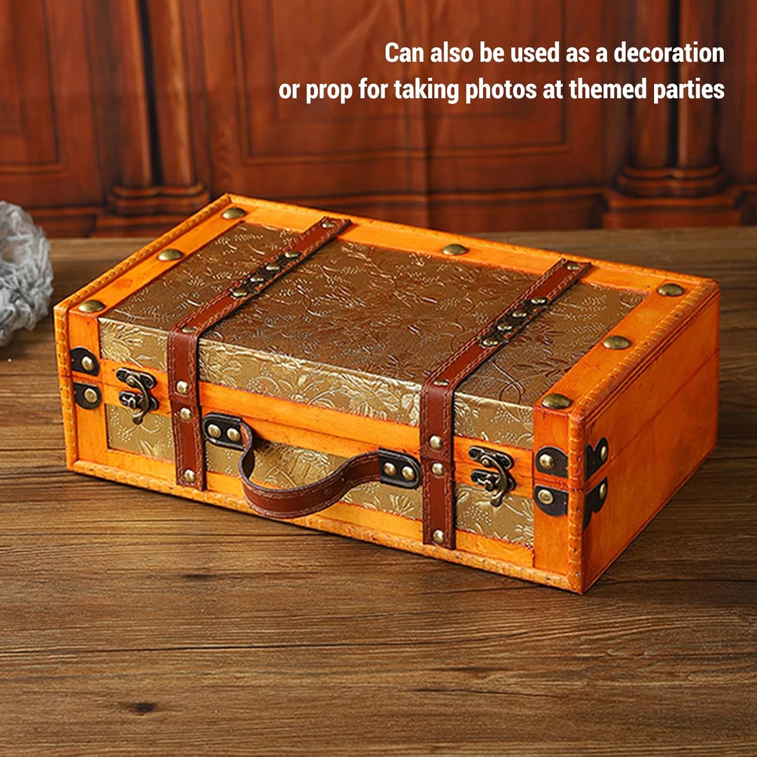 1. Vintage Wooden Storage Box: Can be used as a home decoration, placed on a coffee table, bookshelf, or any place that requires additional storage space. 2. Multi Purpose: You can also use this vintage luggage trunk as a photo decoration or prop at themed parties, enhancing the ambiance. 3. Premium Materials: This antique storage chest is made from wood and leather materials, sturdy and stable, ensuring long lasting usage. 4. Practical and Beautiful: With a large storage space, capable of storing various household items and serving as a decoration for living spaces. 5. Thoughtful Design: Using buckle for fixation to reliably secure the items inside, with a portable handle, making this vintage suitcase easy to carry. Carry on suitcase cute vintage trunk luggage bag for women, decorative storage boxes suitcase for decoration, storage, decorative travel themed chest paperboard boxes, small stackable storage chests for jewelry, chest box for themed parties, bedroom display or party decor, wooden vintage luggage trunk antique storage chest. Spec: Item Type: Vintage Suitcase Material: Leather, Wood Size: Approx. 34x20x11cm / 13.39x7.87x4.33in Package List: 1 x Vintage Suitcase