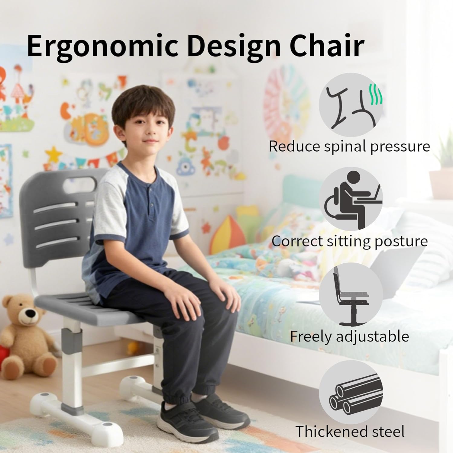• 🌟 Ergonomic & Height-Adjustable: The desk and chair’s height can be easily adjusted to match your child’s growth, promoting proper sitting posture and reducing back pain and eye strain during study, writing, or art time.​