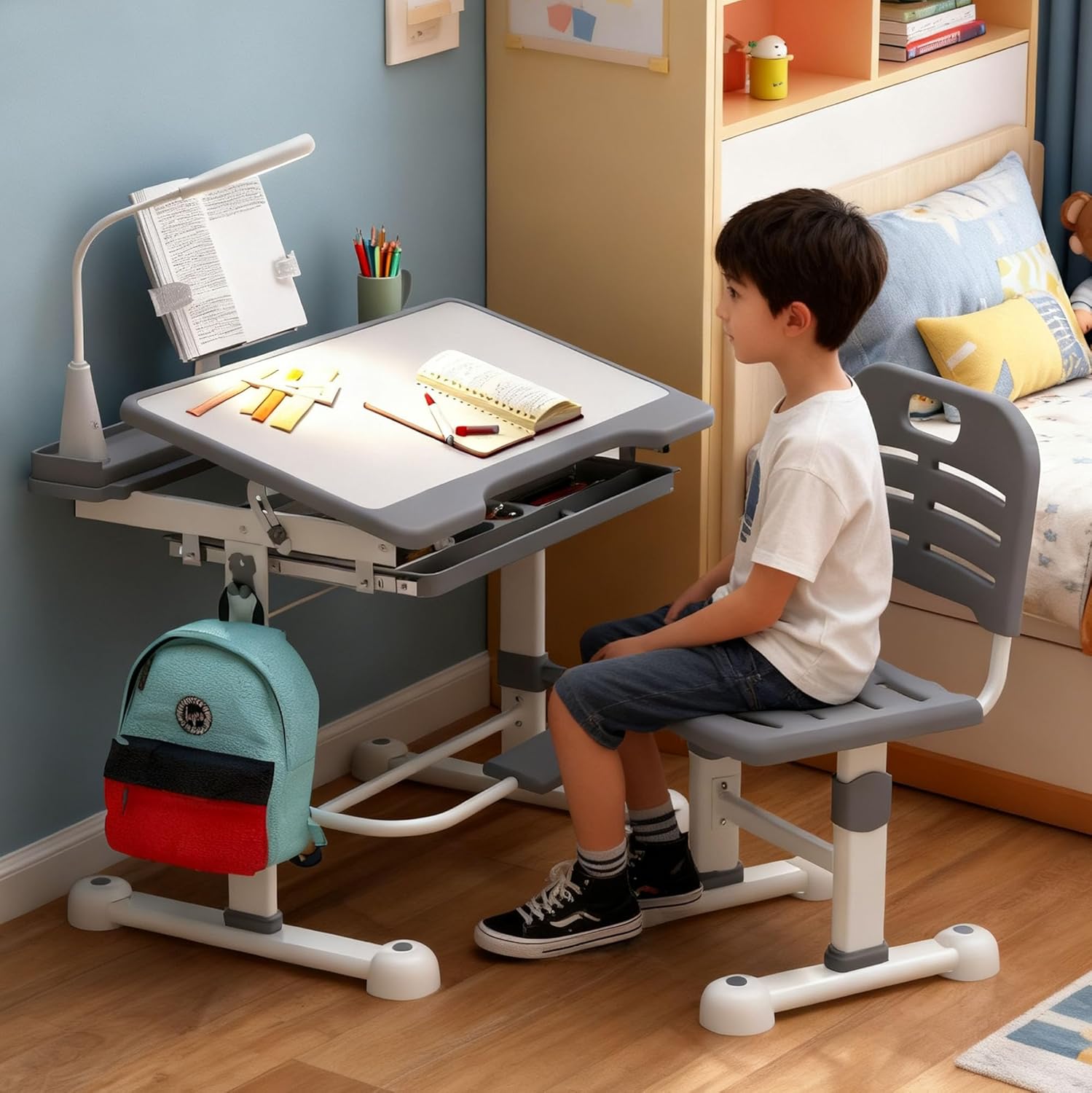 SHGJ&SOFT Kids Desk and Chair Set, Ergonomic Height Adjustable School Study with Tilt Desktop, 3 Modes&3 Brightness LED Light,Storage Drawer,Book Stand for Study Room,Classroom(Grey,Desk andChair Set)