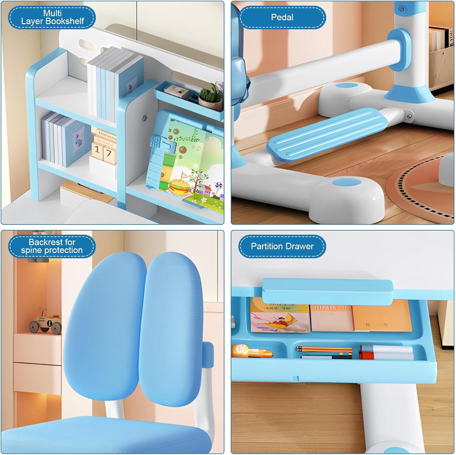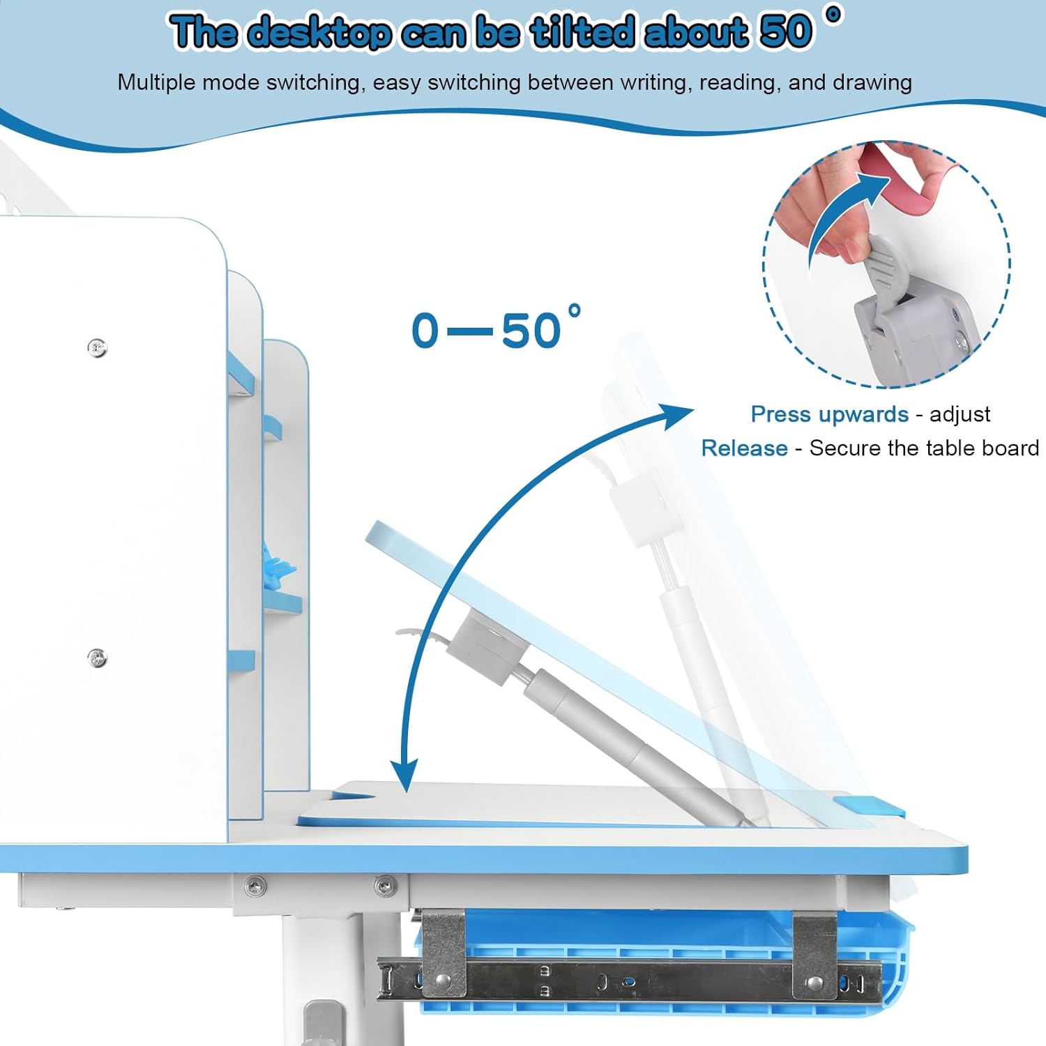 Adjustable Desktop Tilt for Comfort: Our smaller desktop features an adjustable tilt range from 0-degree to 50-degree, allowing your child to paint and use the computer with ease and comfort. Perfect for hours of creative play and learning.Spacious Writing Area for All Needs: Our desk offers ample writing space, perfect for accommodating all your child's needs. With smart compartmentalized sections, stationery stay organized and within reach, simplifying homework and creative projects.Durable and Sturdy: This table and chair set is made of high-quality fiberboard and sturdy metal frame, which is durable and long-lasting. It can withstand daily use and provide reliable support every day, whether your child is studying or playing.Flexible Height Adjustment: Easily adjust the desk and chair heights to cater to your child's growth. Parents can modify them effortlessly, ensuring a comfortable and supportive learning posture at all times.Large Storage Space and Comfortable Sitting Experience: Our desk features a spacious drawer to neatly store all learning tools, ensuring a tidy table that makes it easier for your child to focus on homework and activities. Plus, the ergonomically designed tables and chairs provide stable support, keeping children's backs healthy and comfortable during prolonged sitting.Item Name: Study Desk And ChairMaterial: Plate, MetalFeatures: Spacious Writing Area, Large Storage Space, Height AdjustableDesk Load Capacity: Approximately 300kgDesktop Tilt Angle: 0-Degree to 50-DegreeSize Details:Desk, Size: 119cm x 80cm x 56cm/46.85" x 31.5" x 22.05" (Approx.)Chair, Size: 48cm x 38cm x 37cm/18.9" x 14.96" x 14.57" (Approx.)Package Includes:1 x Children's Study Table1 x Children's Study Chair1 x Instruction