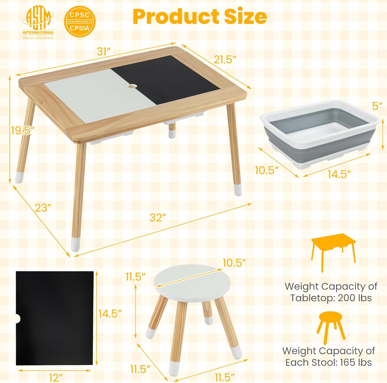 Description:The kid's sensory table and chairs set features premium pine wood legs, providing excellent stability and peace of mind for parents during active play. 2 double-sided tabletops allow little ones to switch between whiteboards and chalkboards for lunch, books, or puzzles. The toddlers activity table also has 2 removable bins, keeping art supplies and toys neatly tucked away yet readily accessible. After use, you can store the stools under the tabletop. Additionally, the cut-out handles enable kids to safely remove the boards, while rounded corners protect delicate skin. Features:Serves as a study desk & chair, dining table & chair, drawing table, storage table, sand table, or water tableChalkboard & whiteboard for drawing, studying, or writingHigh-quality pine wood is enduring, splinter-free, and sturdy2 removable & foldable bins for ample storageCut-out handles for kids to easily move the tabletopASTM/ CPSIA compliant for safe and reliable useGreat for kid’s imagination, creativity, fine motor skills and logical thinkingRounded corners for safe touchAnti-slip foot pads for added sturdinessWipe-clean surface for easy cleaningEasy-to-install design saves energySpecifications:Color: Natural + White + BlackMaterial: Pine Wood + MDFProduct Size of Table: 32” x 23” x 19.5” (L x W x H)Size of Tabletop: 31” x 21.5” (L x W)Size of Each Storage Bin: 14.5” x 10.5” x 5” (L x W x H)Weight Capacity of Tabletop: 200 lbsWeight Capacity of Each Stool: 165 lbsProduct Size of Each Stool: 11.5” x 11.5” x 11.5” (L x W x H)Net Weight: 21 lbsPackage Includes:1 x Kids Table2 x Stools1 x User Manual