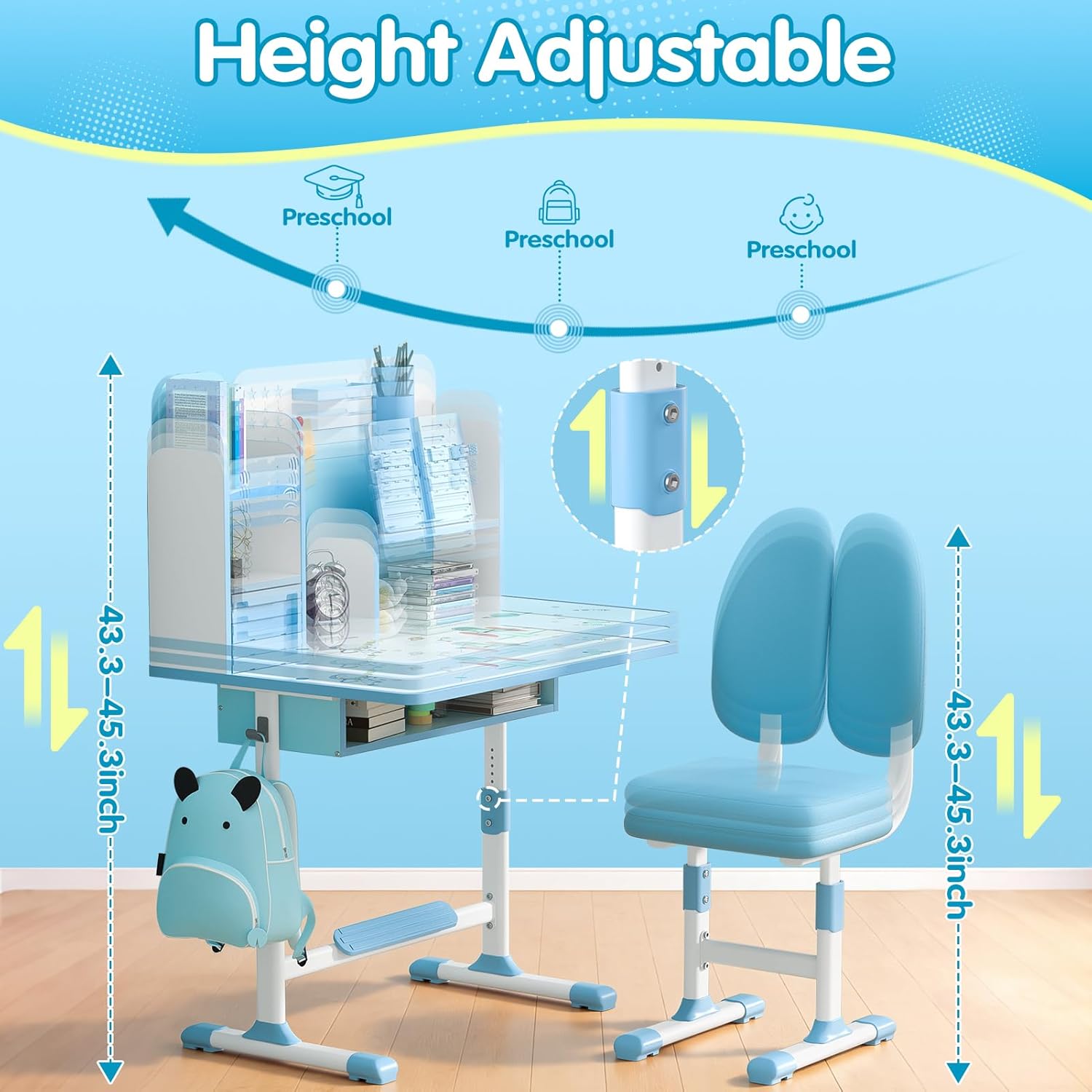 Item Name: Desk Chair SetAges: 3-18 Years OldMaterial: Steel, Density BoardFeatures: Adjustable Height, Sliding Drawer, Backpack HooksSize Details:H: 115cm/45.28", L: 80cm/31.5", W: 50cm/19.69" (Approx.)Notes:Due to the light and screen setting difference, the item's color may be slightly different from the pictures.Please allow slight dimension difference due to different manual measurement.Package Includes:1 x Desk (Others Not Included)1 x Chair1 x Installation Kit1 x English User Manual