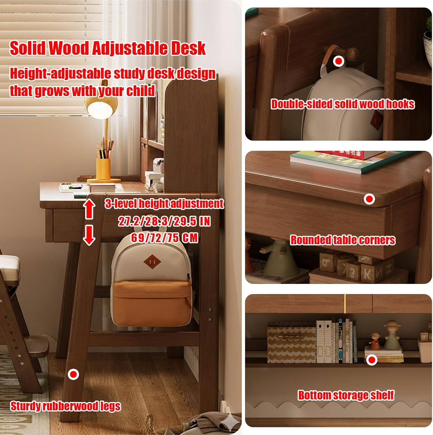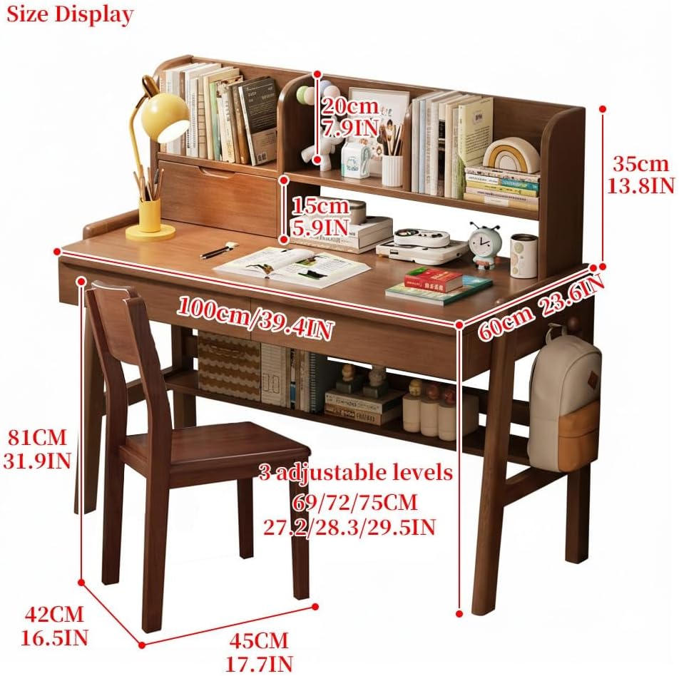 Classified StorageThe large desktop is suitable for putting books or a laptop while the hutch and the drawers provide extra storage space to keep all learning supplies in order and create a neat and personal studying environment by placing different items in their own way.2 Storage Drawers2 drawers for storing study or work tools offers you neat desktop.Bezel CoamingThe desk features a retro coaming design with smooth lines to prevent items from falling off.Storage ShelfThe bottom storage shelf design enlarged the desk storage capacity, which can be used for storing audio, router boxes, etc., makes the desktop more concise. The shelf also makes the desk more stable.Easy AssemblyOur writing desk is easy to assemble, contains screws, tools and instructions required for installation, no additional tools are required. Follow the assembly steps to complete easily within 20 minutes.Widely UsePerfect for learning, painting and more, this sturdy desk can be used in bedroom, study and living room.Specifications:Name: Computer writing deskStyle: ModernMaterial: Solid RubberwoodDimensions:Desk:100x60x110cm(39.4x23.6x43.3inch)Chair:81x42x45cm(31.9x16.5x17.7inch)Package Includes:1 x Desk1 x Chair