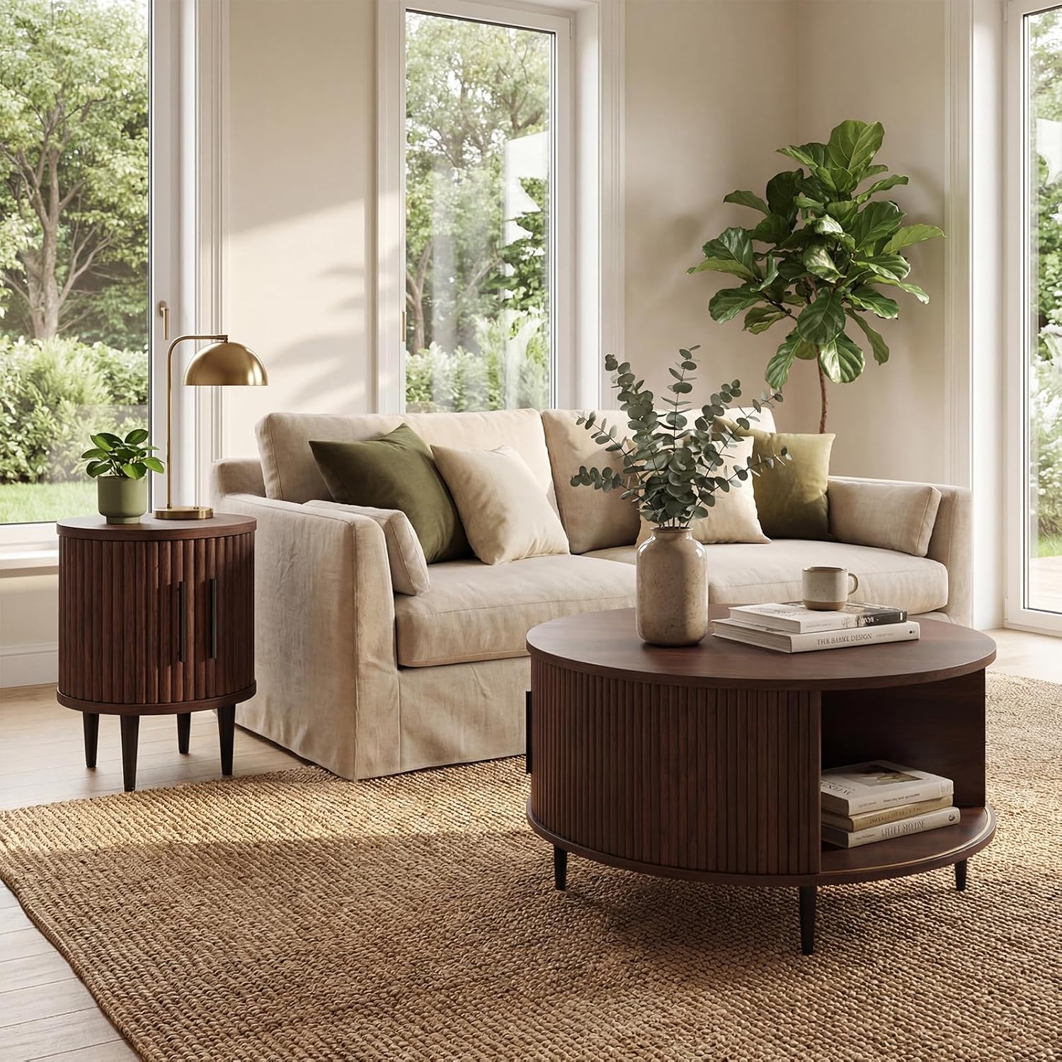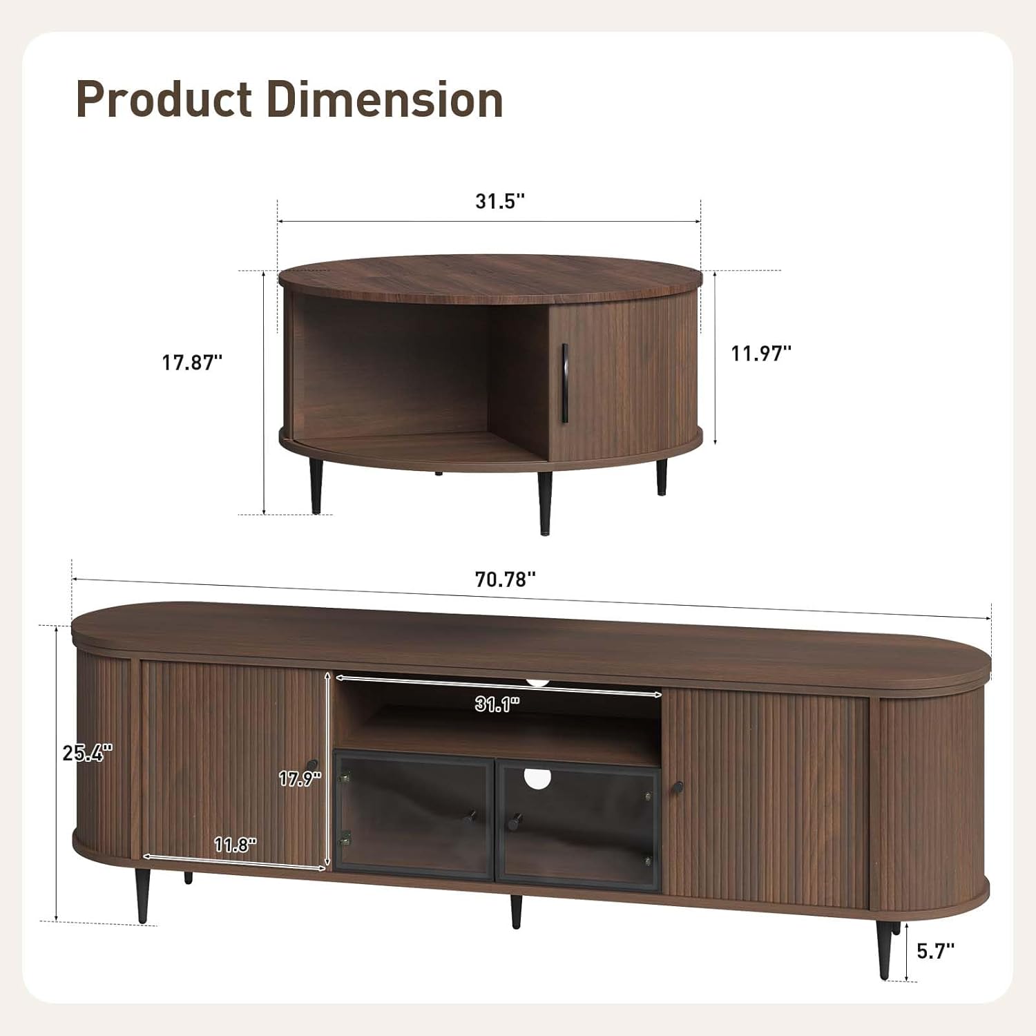Luxury Table Set Includes 70" Fluted TV Stand & 31.5" Mid Century Fluted Coffee Table with Storage, for Living Room, Brown