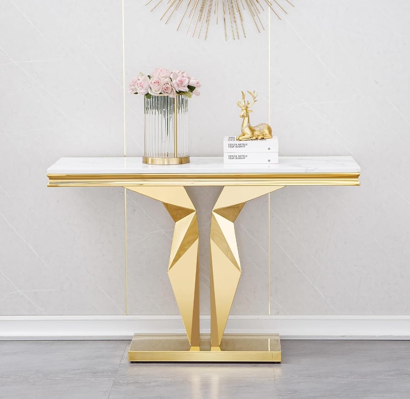 This beautiful contemporary work places a strong emphasis on lustrous materials that make a bold statement of personality and style. Shiny stainless steel frame and marble top complement each other perfectly, making the table more visually appealing. The faux marble Coffee Table has a Geometric base with mirrored silver/gold finish for a modern glamour look. Imitation marble top features unique and attractive textures, highlighting your display with its luxurious appeal. Simple design, only a few steps, clear instruction and labeled parts help you effortlessly assemble it.
