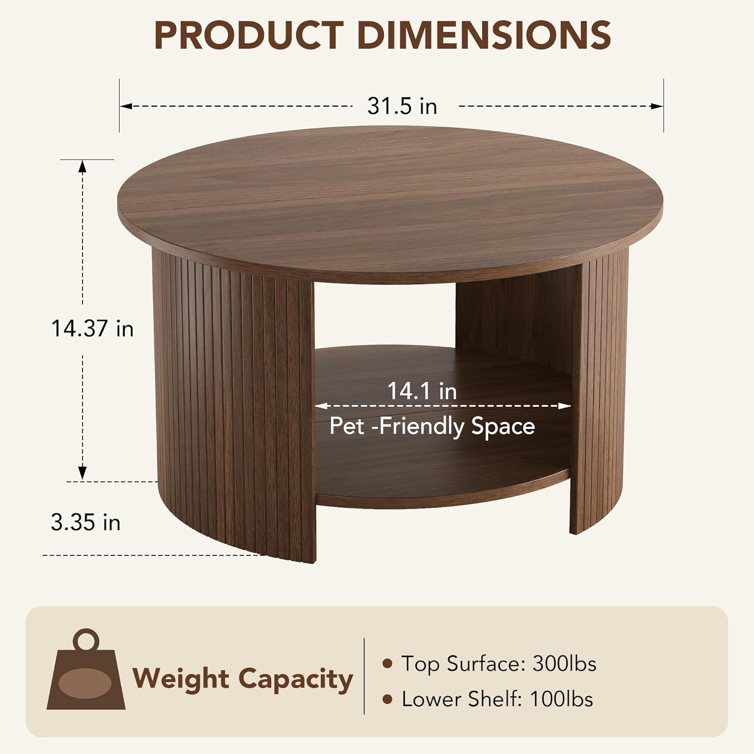 | Size | Round, 31.5-inch diameter, 18-inch height |