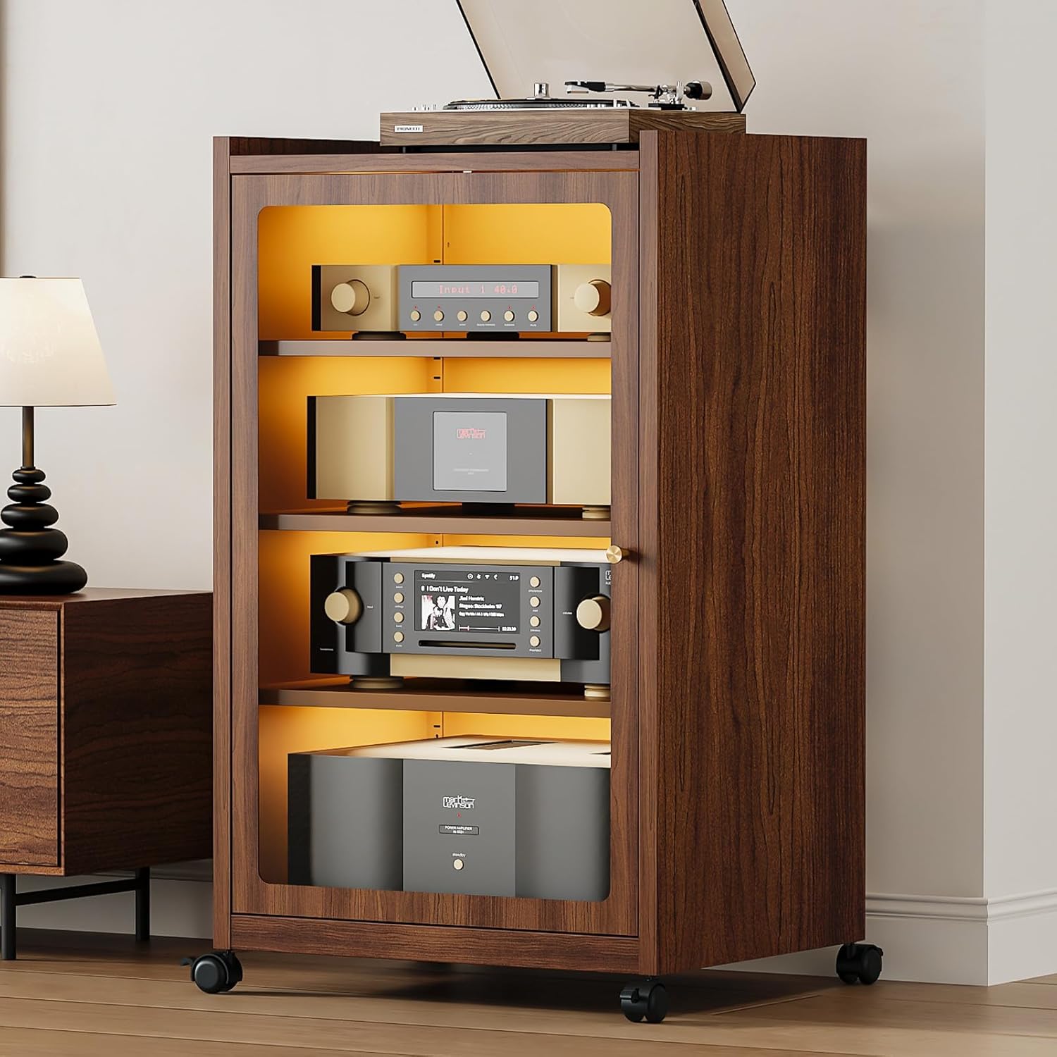 • 【Cable Management & Smooth Mobility】Multiple cable management holes on the back panel help organize power cords and audio cables, keeping your setup neat and clutter-free. Equipped with four smooth casters (two lockable), this audio cabinet is easy to move for cleaning or repositioning. The locking wheels keep it securely in place when needed, while the quiet rolling design protects your floors and ensures smooth movement.