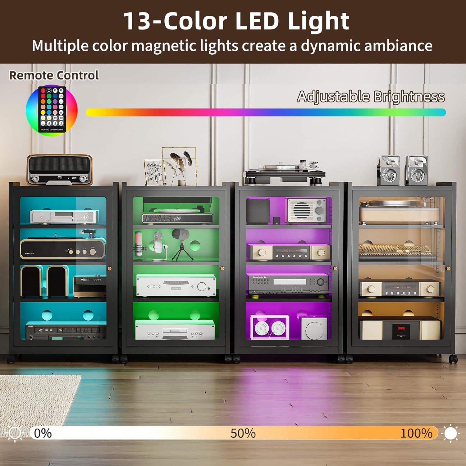 • 【Tempered Glass Door & LED Lighting】Equipped with tempered glass door, this stereo cabinet keeps your devices visible while protecting them from dust. The transparent panel allows remote signals to pass through easily, letting you control your stereo system without opening the door. The built-in 13-color LED lighting highlights your stereo system and creates an eye-catching display for your home entertainment setup.