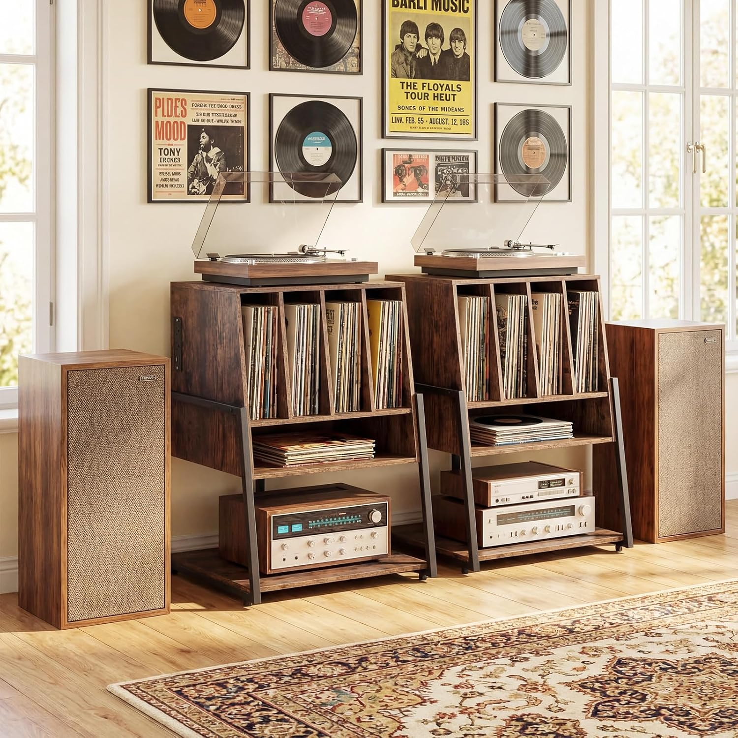 Description:Upgrade your listening corner with a rolling vinyl station that keeps everything powered, sorted, and ready to play. A convenient side power hub offers 2 outlets plus USB and Type-C charging, while routing cords neatly out of sight for a tidy look. The divided compartment helps you file records for quick browsing, and the spacious top with open shelving holds your turntable, speakers, and decorations across 3 levels. Built on a sturdy T-style metal frame, it supports up to 165 lbs for dependable everyday use. Glide it anywhere on smooth casters (2 with locking function), or switch to adjustable foot pads for a stable, stay-put setup. It is finished in a sleek modern-industrial style for any room.Features:Versatile storage solution to keep your music supplies well organized3-tier storage with 4 record compartments, an open compartment and bottom shelf Built-in power strip provides 2 AC outlets, a USB and a Type-C Ports2 installation options with wheels and adjustable foot pads for different needs4 universal casters, 2 with brakes, ensure easy mobility and stable placementHeavy-duty metal frame ensures reliable supportAssembly neededSpecifications:Color: Rustic Brown/BlackMaterial: Engineered Wood, MDF, MetalOverall Dimensions: 23" x 21" x 30" (L x W x H) Dimensions of Tabletop: 20" x 15.5" (L x W)Dimensions of Record Compartment: 4.5" x 17.5" x 12.5" (W x D x H)Dimensions of Open Compartment: 19" x 18.5" x 4.5" (W x D x H)Dimensions of Bottom Shelf: 20" x 21.5" x 10" (W x D x H)Power Cord Length: 4.9 ftAC Outlet: 125V/12AUSB + Type-C: 5V/2.4A, 12W MaxTotal weight Capacity: 165 lbsNet Weight: 41 lbsPackage Includes:1 x Record Player Stand1 x User Manual