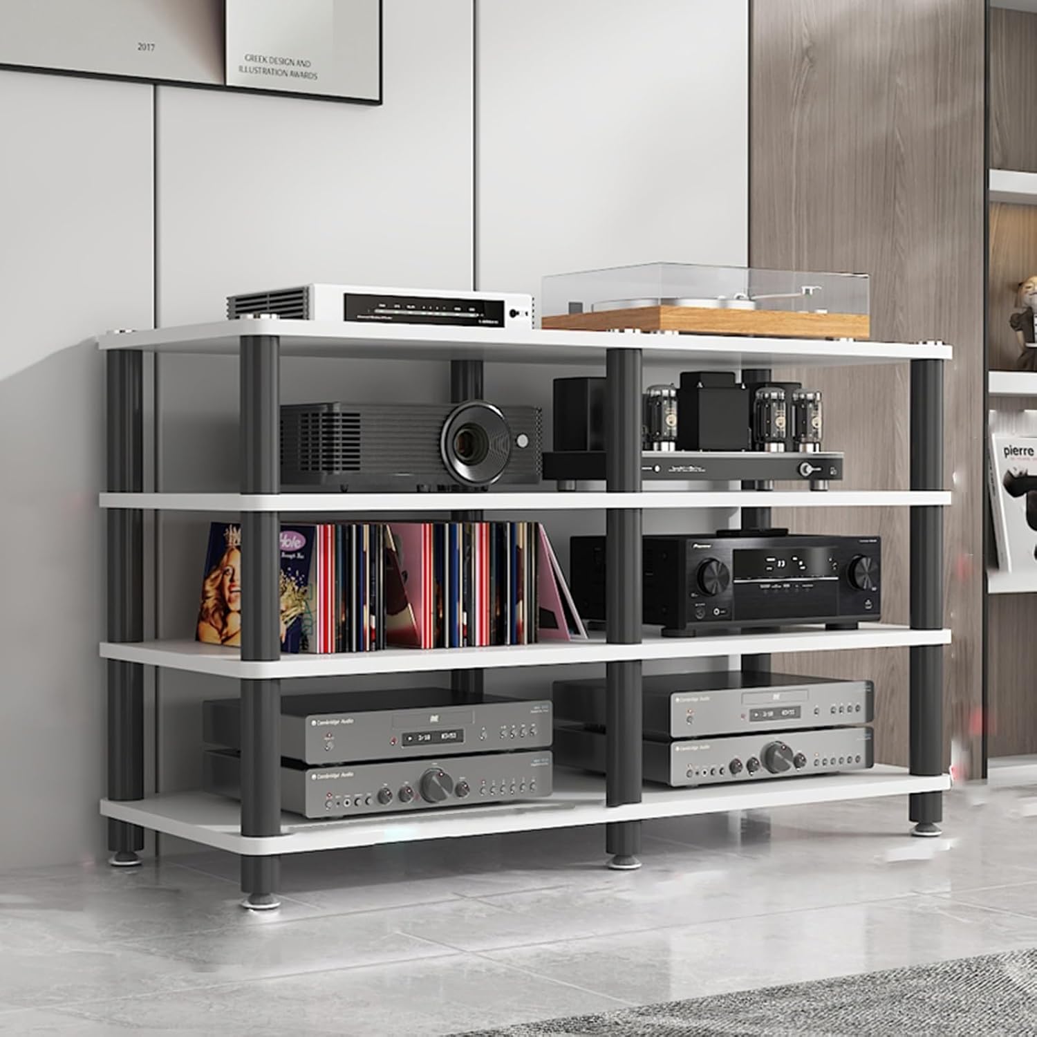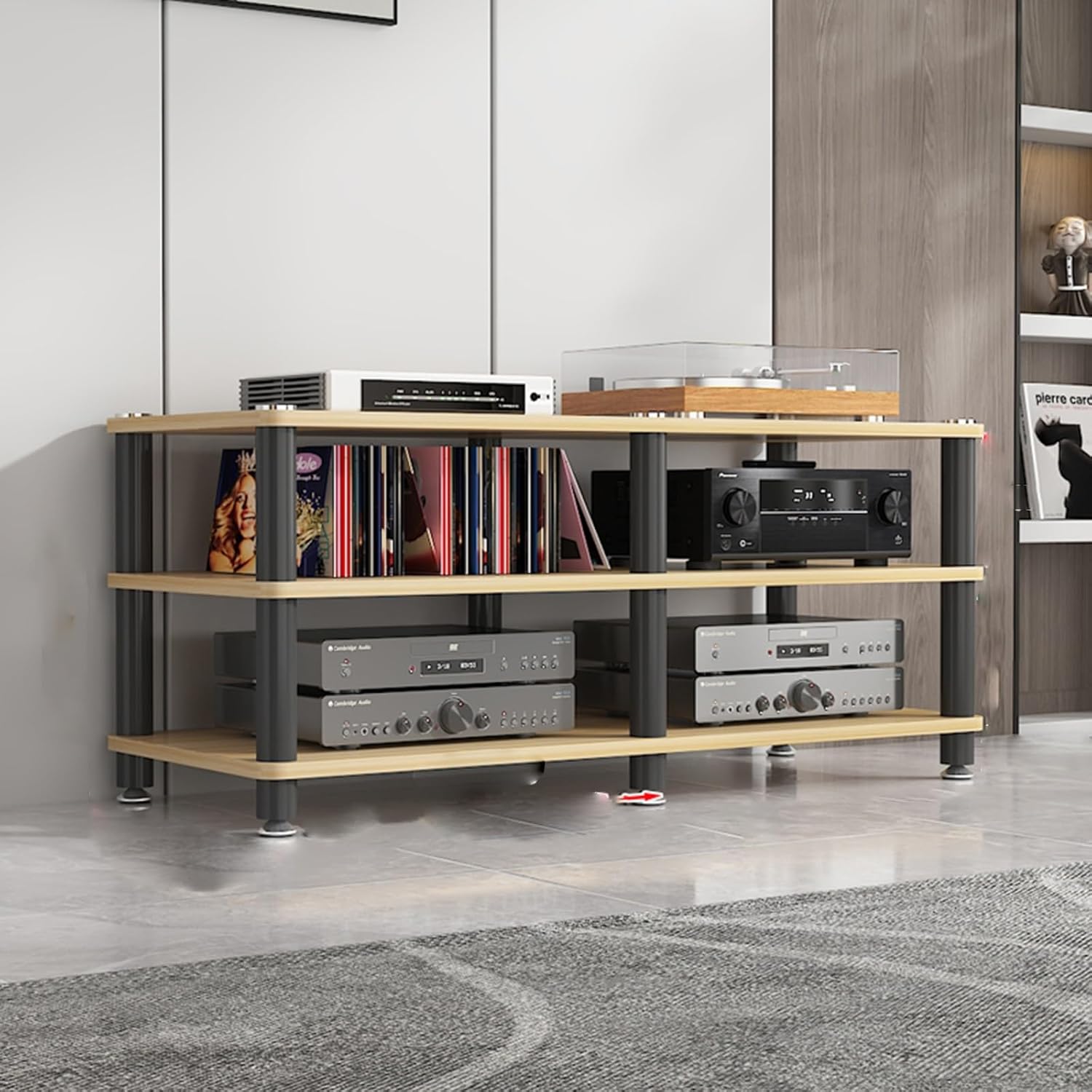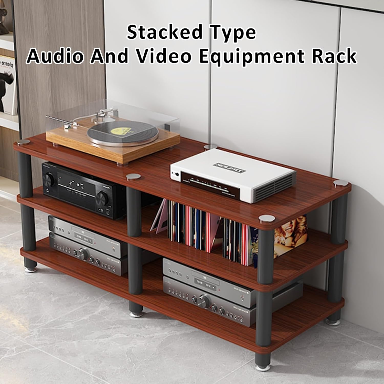 Floor-Standing Audio Rack Record Player Console Cabinet Tall Heavy Duty Audio-Video Media Stand1.Stacked audio-visual equipment rack offers organized, dedicated spaces for all your electronics2.Multi-function audio-visual equipment rack serves as a versatile hub for your entertainment needs3.Multi-layer open storage provides easy access and ventilation for devices and accessories4.Two styles available to suit modern or traditional décor5.Multiple colors and multiple sizes ensure a perfect fit for any space6.Ideal for TVs, gaming consoles, and media players7.Keeps your living area tidy and stylish8.Adds a modern touch to your home9.Elevate your entertainment setup with this media console cabinetProduct specifications:Material: ironStyle: modern and fashionableColor: as shown in the pictureNumber of layers: 3/4 layerSize: 120x40x50cm/47.2x15.7x19.7inFurniture structure, frame structureScene: living room, bedroom, home, office, school, studyPackage content: 1 x record player standNote:1. Only storage racks are sold, and other products are shooting props.2. Due to the influence of the monitor and light, the actual color of the product may be slightly different from the color shown in the picture. Thank you!3. Due to manual measurement, please allow measurement deviation of 1-2cm.