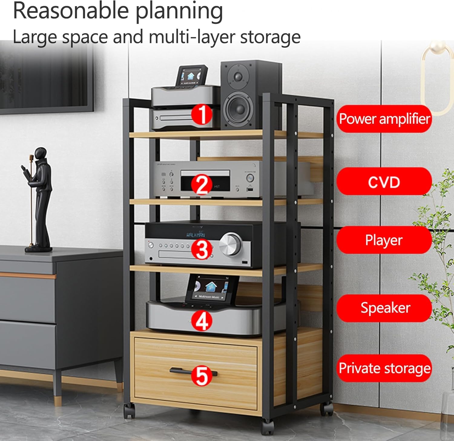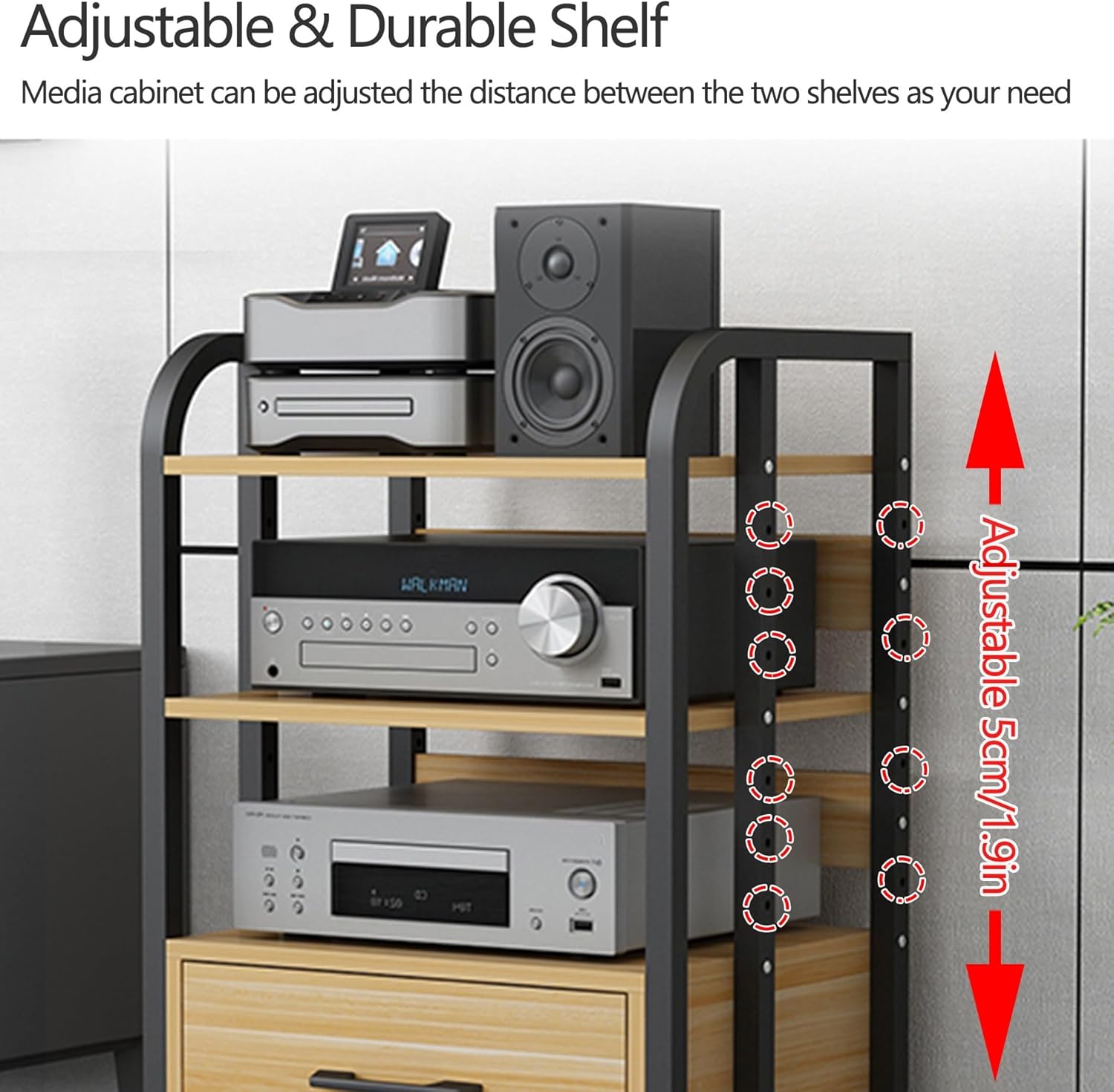 Side Table or AV Media Stand? – As you wish! With removable dividers, you can organize the storage space as needed. Remove the dividers to create additional room.Q: What is the maximum load capacity?A: 150 kg (330 lbs).Features: Open storage for efficient space usage. Adjustable shelves for easy and convenient setup. The open design prevents your electronics from overheating. High weight capacity for long-lasting use. Ideal for homes, offices, stores, and more. Easy to clean: Simply wipe with a damp cloth. Your audio/video devices fit perfectly, combining strength and aesthetics. Wheels make it easy to move the stand.Use:Audio-video shelving ideal for audio/video devices, TV accessories, DVD players, gaming consoles, TV boxes, jukeboxes, and more.Details:Material: Steel + WoodNumber of Shelves: 4 levelsAdjustable Spacing: 6.4 cm (2.5 inches)Assembly Required: YesCompatible with: Players, gaming consoles, TV boxes, Xbox, Wi-Fi routers, turntablesSuitable for: Home, cinema, recording studio, game roomPackage Includes: 1 × AV Media StandNotes:Due to manual measurement, a difference of 1-2 cm may occur.Colors in the photos may vary due to lighting and different monitor displays.Warning:Maximum load capacity of 150 kg. Do not overload the stand to avoid damage or accidents.