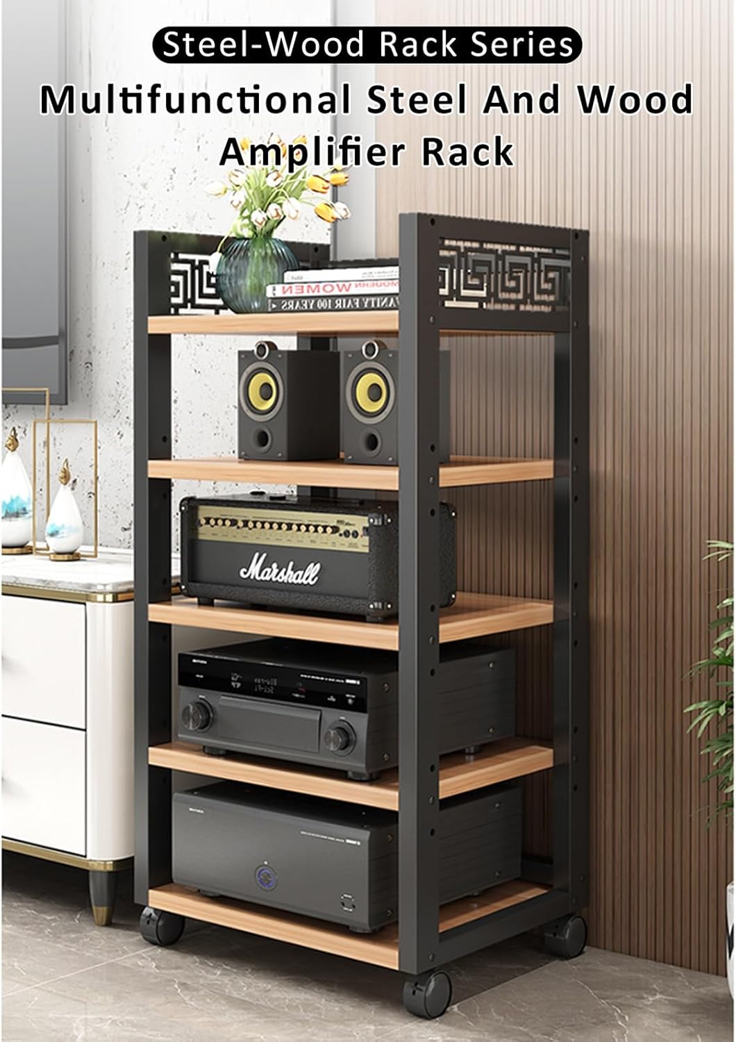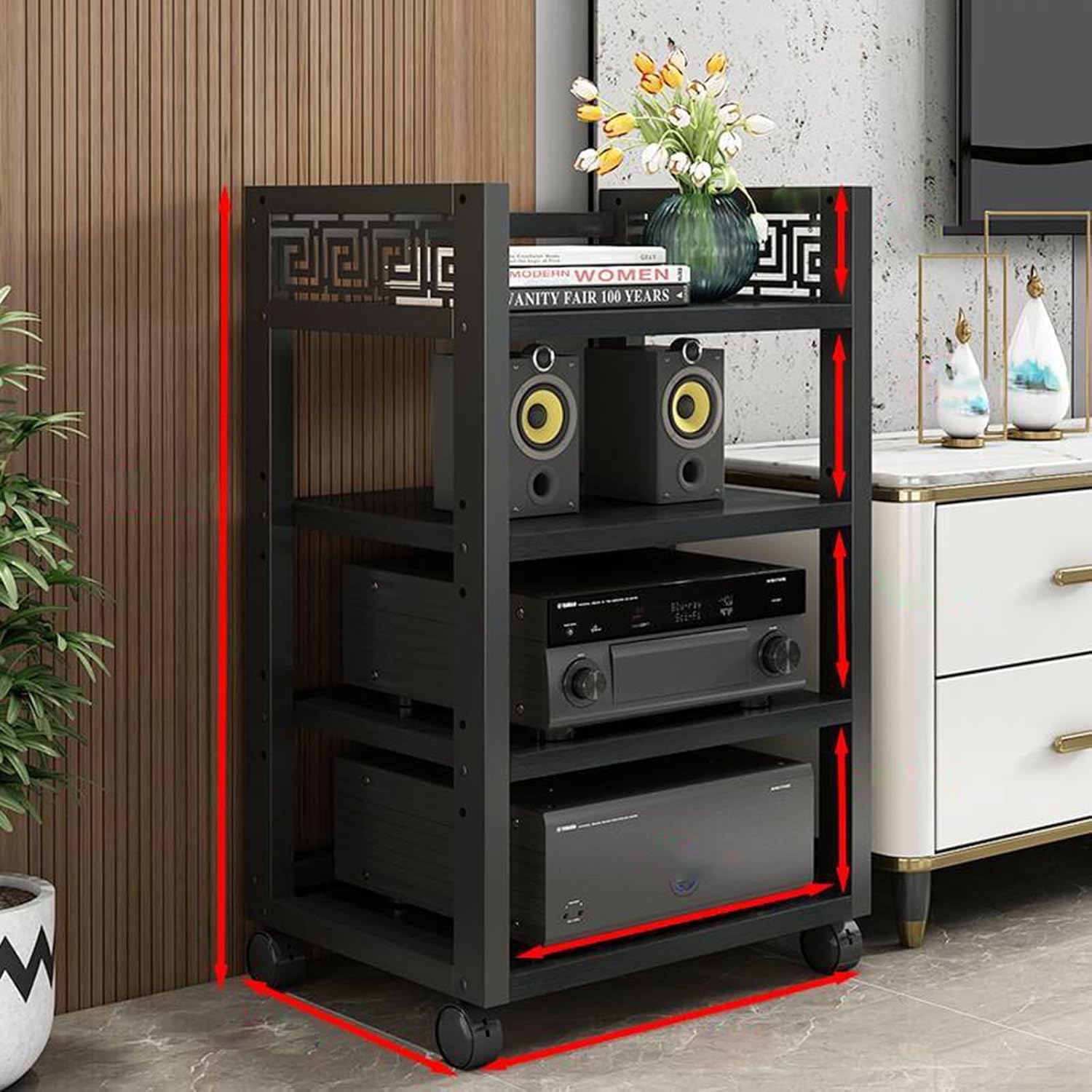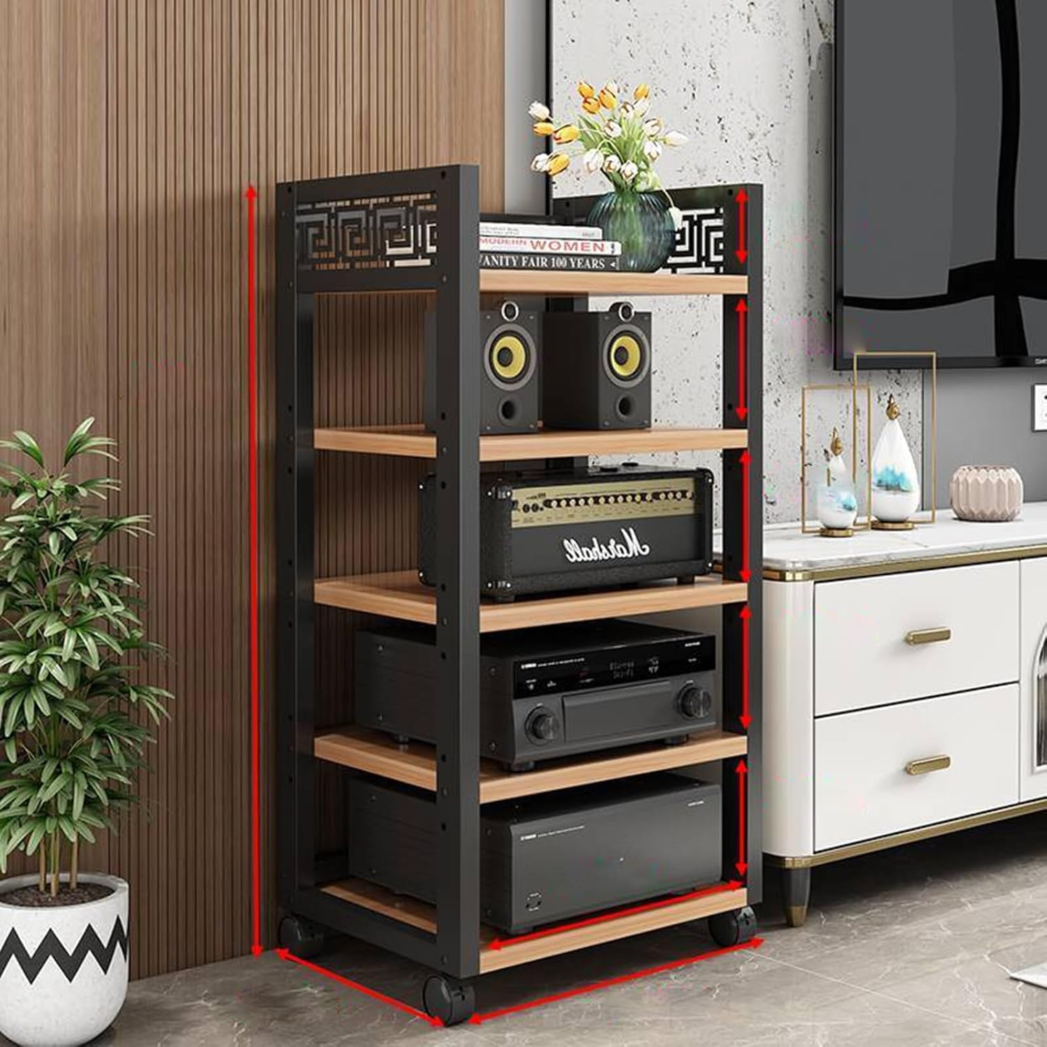 Stereo Stand Record Player Stand with Storage 3-Tier AV Media Stand Corner Shelf1.Open rack for storage rack offers easy access and ventilation for your electronics2.Multi-layer storage, designed to maximize space, keeps your area organized3.No space occupied with the compact, vertical design, ideal for any room size4.Strong load-bearing capacity ensures for heavy equipment5.Stable structure prevents wobbling and secures your devices6.Increased layer spacing accommodates taller items7.Adjustable layer height provides customizable storage options8.Applicable scenarios include living rooms, bedrooms, offices, and moreProduct specificationsMaterial: iron artStyle: modern fashionColor: as shown in the pictureNumber of layers: 3/4/5 layersSize: 50x40x68cm/19.7x15.7x26.8inFurniture structure, frame structureScene: living room, bedroom, home theater, game room, recording studio, conference room, concert, office, school, study, theater, KTVPackage content: 1 x record player standNote:1. Only storage racks are sold, other products are shooting props.2. Due to the influence of the monitor and light, the actual color of the product may be slightly different from the color shown in the picture. Thank you!3. Due to manual measurement, please allow measurement deviation of 1-2cm.