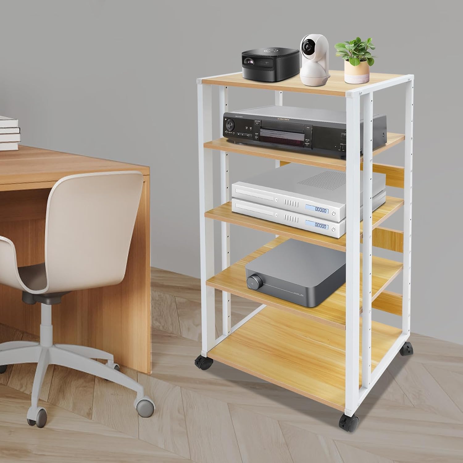 Details:Protective Covers: They enhance the aesthetics of the product while protecting your hands during daily use and cleaning.Practical Baffles: They can effectively protect devices placed on the product.Application:This product can be used in places such as study rooms, kitchens, bedrooms, dining rooms, living rooms, multimedia rooms, studios, recording studios, etc. It can hold amplifiers, stereos, karaoke machines, projectors, CD/DVD players, books, stationery, potted plants, and more.Specification:Material: MDF, Carbon Steel, PlasticProcess: Baking PaintColor: White + Wood ColorStyle: ModernShape: RectangularAssembly Required: YesMount Type: FreestandingWheel Type: 4 * Lockable Universal WheelsNumber of Tiers: 5Overall Max. Load-Bearing Capacity: Approx. 40-50kg/88.18-110.23lbsEach Tier Load-Bearing Capacity: Approx. 20kg/44.09lbsProduct Size: 50*40*109cm/19.7*15.7*42.9inPackage Size: 108.5*44.5*13cm/42.7*17.5*5.1 inGross Weight: 17.6kg/38.8lbsNet Weight: 17kg/37.48lbsPackage Included:1 * 5-Tier AV Media Stand Rack4 * Lockable Universal WheelsOther Accessories for AssemblyNotes:1. Please carefully check the product size before purchasing.2. Please note that this product does not include any other items.
