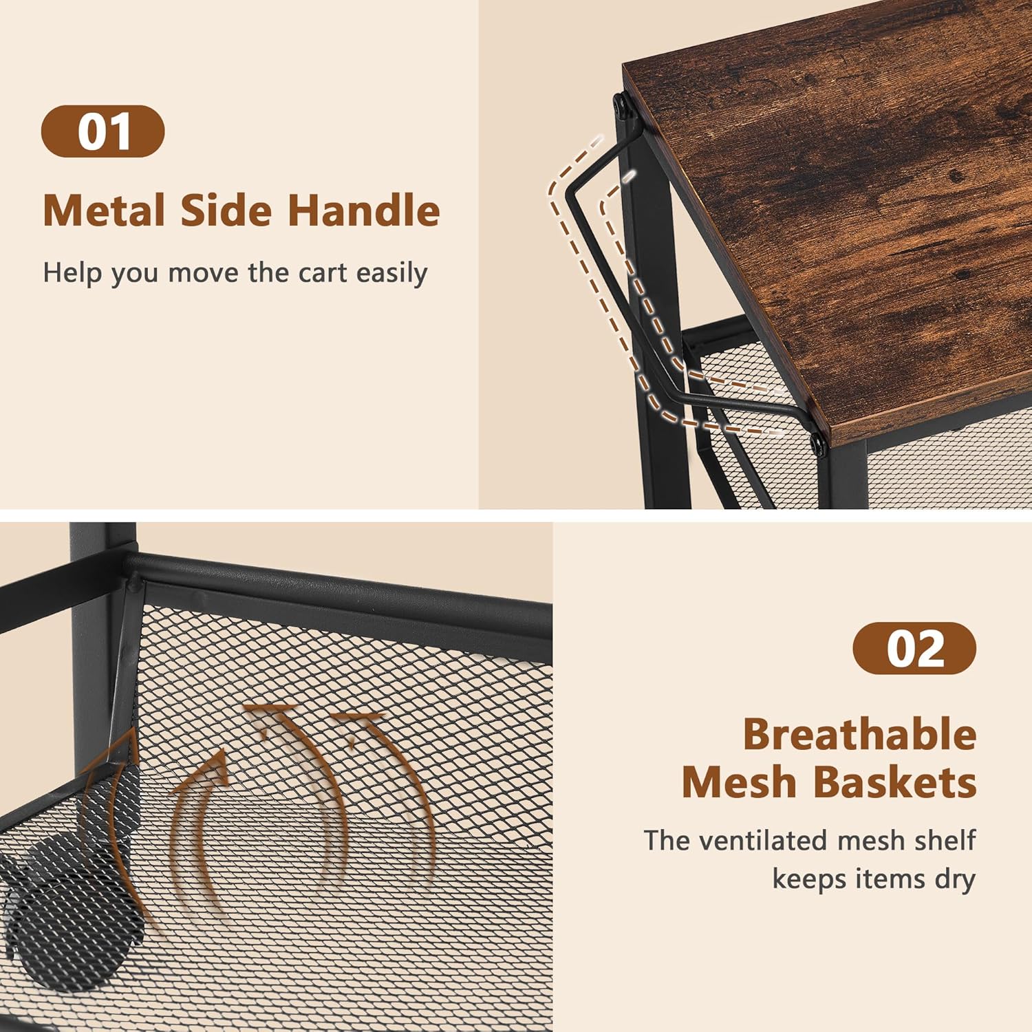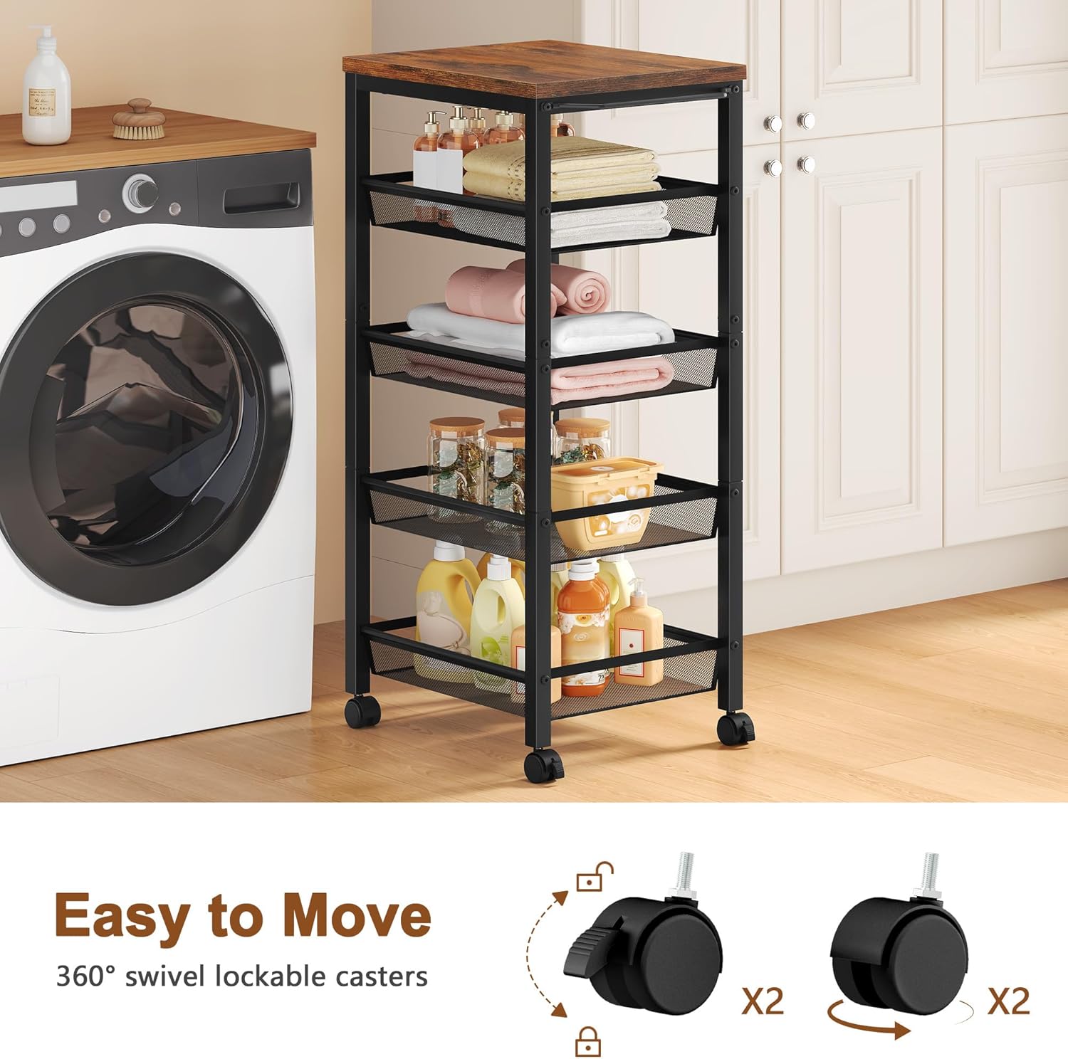5 shelves made of metal material and wooden boards, easy to clean and durable. Shelves are fitted with wire shelves and are hollowed out for easy drainage. The top shelf can safely hold approximately 60-110lbs of heavy items and the bottom 4 tiers of storage baskets have a maximum weight capacity of 22-52lbs, perfect for your family's storage needs.
