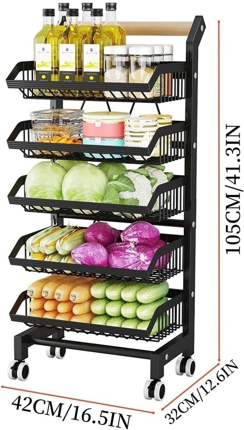 This multifunctional kitchen organizer is more than just a storage rack, with our 5-layer commercial fruit and vegetable rack shelf, you can keep your home or supermarket tidy and easy to find. 5-layer retail display rack, fruit basket kitchen cart, supermarket shelf is suitable for retail, home use or commercial use.Specifications:Name: Vegetable Storage Basket / Snack RackMaterial: Thickened Carbon SteelColor: White / BlackNumber of Layers: 5 LayersSize: 42 *32*105 cm / 16.5*12.6*41.3 inchesInstallation method: Floor-standingFeatures:1. Thickened steel frame, strong load-bearing.2. Corner storage, space-saving.3. Removable basket, convenient.4. Adjustable layer height, can store items of different heights.5. Breathable mesh basket, breathable and easy to clean.6. Universal wheel design, easy to move7. Suitable for supermarkets, convenience stores, homes and offices.Package:1*Fruit and Vegetable Basket Cart (excluding decorations)Tips:1.Due to the display and lighting, there may be some differences between the picture and the product, please refer to the actual product.2.Due to manual measurement, please allow 1-3cm error.3.This product does not include fruits, vegetables and other display items.