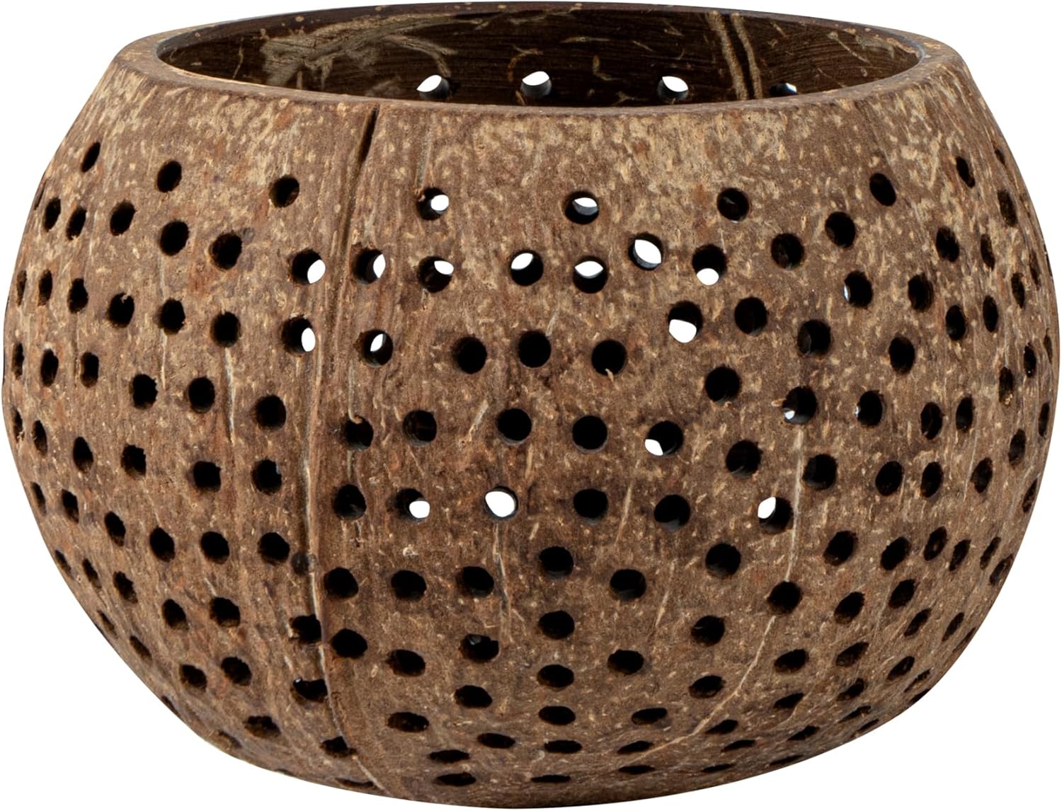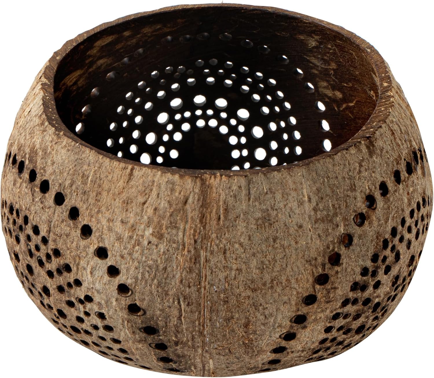 Introduce a touch of tropical elegance with our Coco Casa Tan Handmade Coconut Shell Candle Holders. Handcrafted with precision, these coconut shell candle holders showcase a unique dotted pattern that creates enchanting light patterns, adding a spellbinding charm to your dining setting or special event. These decorative candle centerpiece serves a practical purpose while enhancing your decor with their festive and tropical allure. These tropical candle decors are sustainable and reusable, making them a responsible choice for ecologically-conscious businesses. Crafted with real coconut shells, these unique candle holders are sustainable, demonstrating your commitment to reducing impact on the environment. With a measurement of 4 inches in diameter by 3.3 inches in height, these candle holders are compact yet captivating, perfect for creating a warm and inviting ambiance. Coconut shells vary in size, due to which the dimensions of our shells may differ slightly. Sold in a 10 count box.